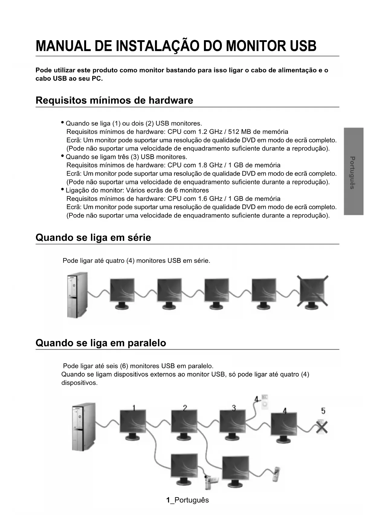 no tabuleiro do sistema na parte inferior do ecrã. 2.Clique no ícone de monitor para fazer aparecer uma lista de monitores USB ligados. Exemplo: a figura seguinte mostra quando dois monitores USB estão ligados. 3.Seleccione o monitor para o qual quer configurar as definições de visualização. Pode configurar as definições "Screen Resolution", "Color Quality" e "Screen Rotation" para o monitor. USB_Monitor_install_guide.fm Page 4 Wednesday, October 10, 2007 1:46 PM5_Português Português As definições do ecrã inicial depois de instalar o programa Modo aplicável: Modo alargado Modo de posição: À direita do ecrã primário Modo de rotação: 0° Monitor USB – Limitações OS suportado (Sistemas operativos) Windows XP - Service Pack 1 ou inferior: Não suportado - Service Pack 2 ou posterior: Suportado Windows 2000 - Service Pack 3 ou inferior: Não suportado - Service Pack 4 ou posterior: Suportado Windows Server 2003 - Não suportado Windows Vista - suportado (64 bits - não suportado) - Para verificar a informação no sistema operativo do PC, clique com o botão direito em ‘O meu computador’ no ‘Ambiente de trabalho’ do Windows e seleccione ‘Propriedades’ no menu apresentado. Verifique a informação no separador ‘Geral’ da janela ‘Propriedades do sistema’. Uma vez que este monitor USB é reconhecido como um dispositivo USB, não aparece o ecrã do DOS como nos monitores gerais quando se liga um PC. - Se quiser utilizar o seu monitor USB como Monitor Principal, ligue também um cabo D-Sub (para sinais analógicos) ou um cabo DVI (para sinais digitais). Não pode utilizar o monitor USB para software usando a aceleração de hardware em 3D. - Real Player (O modo de expansão não é suportado.) - Para a maior parte dos jogos em 3D - Programas executados com base em Direct X Programas de filmes suportados - Power DVD - Win DVD(Versão 5 ou posterior.) - VLC Este monitor não suporta o programa MagicTune. - A função MagicRotation pode não funcionar normalmente. - Se o programa MagicTune estiver instalado no PC, pode não ser compatível com este monitor. O monitor USB não suporta a função de pivot auto. - A função pode não ser suportada, dependendo do modelo. O monitor USB liga-se automaticamente sempre que o cabo de alimentação estiver ligado. - A função pode não ser suportada, dependendo do modelo. O monitor USB pode não funcionar normalmente com o USB 1.0. Se ligar vários monitores USB, é apresentado um ecrã em branco enquanto o PC os reconhece. Os ecrãs são apresentados nos monitores USB depois de o PC os ter reconhecido. Se a placa gráfica do PC não suportar WDDM, o modo alargado pode não estar disponível no Windows Vista. Exemplo: algumas versões de Matrox Card USB_Monitor_install_guide.fm Page 5 Wednesday, October 10, 2007 1:46 PM6_Português Português Lista de Verificação Antes de recorrer ao serviço de assistência, consulte a informação nesta secção para tentar resolver o problema por si mesmo. Caso necessite mesmo de recorrer à assistência técnica, faça-o através do número constante no documento de garantia, do número na secção de informação ou contacte o seu representanter. Não aparece qualquer imagem no ecrã. Não consigo ligar o monitor. Se ligar e desligar o monitor USB rápida e repetidamente, este pode não funcionar normalmente. O seu monitor USB é reconhecido pelo PC como um dispositivo USB normal. Como tal, consulte a informação de resolução de problemas dos dispositivos USB, visitando o site de apoio ao cliente da Microsoft. - Clique com o botão direito do rato em 'My Computer'(O meu computador) e clique em 'Proper- ties'(Propriedades). - Aparece o Gestor de dispositivos. - No menu “Acção”, clique em “Scan for hardware changes (Procurar alterações de hardware)”. - Se o problema se mantiver, tem de reiniciar o computador. O ecrã do monitor USB bloqueia. Verifique a definição ‘Aceleração do Hardware’ para o monitor USB na janela ‘Propriedades de visualização’. Defina o valor de ‘Aceleração do Hardware’ para ‘Máximo’. - Clique com o botão direito do rato no ‘Ambiente de trabalho do Windows’ e clique em ‘Propriedades’. - Aparece a janela “Propriedades de visualização”.Seleccione o separador “Definições” e clique em “Avançadas”. - Se aparecer a janela “Propriedades” para o monitor, seleccione o separador “Resolução de problemas”.Mova o selector de “Aceleração do hardware” para “Máximo”.) O meu computador está ligado e o LED está a piscar. No entanto, o monitor mostra apenas um ecrã em branco. Verifique se o cabo USB está ligado de forma correcta. Volte a ligar o cabo USB. O meu monitor USB está ligado mas o ecrã está em branco. Consegue executar o programa de instalação automática com o monitor USB ligado? Verifica a sua conta de utilizador no Painel de controlo. - Clique em Iniciar – Painel de controlo – Contas de utilizador – Alterar uma conta – Admin: Administrador do computador – Alterar o meu tipo de conta. Na janela que aparece, deve seleccionar o administrador do computador (Administrador avançado ou superior). - Para computadores com o Windows XP. - Defina o seu tipo de conta como indicado acima. - Depois ligue e desligue o botão Power existente na parte da frente do monitor ou volte a ligar o cabo USB anteriormente ligado ao monitor. - Se o problema se mantiver, instale o “Controlador de Instalação do Monitor USB” (USB Monitor Installation Driver) presente no CD fornecido. - Para obter mais informações, consulte a secção do Manual de instalação. - Quando a instalação estiver concluída, reinicie o PC. USB_Monitor_install_guide.fm Page 6 Wednesday, October 10, 2007 1:46 PM7_Português Português P & R Como posso clonar ou alargar o modo de ecrã?