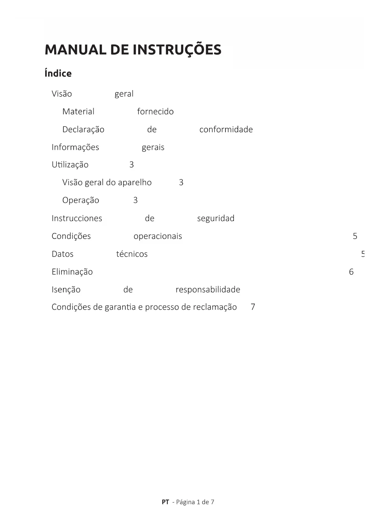 Ulizeoaparelhocomumatemperaturaentre0e40grausCelsiusecomumahumidaderelava doarmáx.de90%(durantepoucotempo).SeoPowerbanknãoforusadodurantemuitotempo, guarde-oaumatemperaturaentre-10e45grausCelsiusecomumahumidaderelavadoar máx.de90%(durantepoucotempo)ecarregue-otodosostrêsmeses,paraconservarasua capacidadetotal. Dimensões: 130x70x16mm Consumodecorrente(entrada): 5V/2.1A Correntedecargaemissão(saída): 5V/2.1A Bateria interna: bateriadepolímerosdelío10000mAh /3,7V Indicação do estado: 4luzesLED Proteçãointegradacontrasobrecarga/ proteçãocontrasobrecarga/proteçãocontra sobretensão/proteçãocontracurto-circuito: Sim CarregamentosimultâneodoPowerbanke carregamentodeumdisposivoconectado: Sim Tempoemstandby: Até3mesesPT - Página 6 de 7 Eliminação de pilhas e baterias angas: Os disposivos idencados com este símbolo estão sujeitos à direva eu- ropeia 2006/66/CE. Todas as pilhas e baterias angas têm de ser eliminadas separadamente do lixo domésco e entregues nos locais previstos para o efeito. A eliminação correta permite evitar danos ambientais. Eliminação de aparelhos elétricos e eletrónicos em m de vida: Os disposivos idencados com este símbolo estão sujeitos à direva europeia 2012/19/CE. Todos os aparelhos elétricos e eletrónicos em m de vida têm de ser eliminados separadamente do lixo domésco e entregues nos locais previstos para o efeito. A eliminação correta de aparelhos elétricos e eletrónicos em m de vida permite evitar danos ambientais. Embalagem: As embalagens são matérias-primas. O material da embalagem deste produto está indicado para a reciclagem e pode ser ulizado. Ao eliminar qualquer po de material, tenha em consideração as normas de reciclagem locais. ELIMINAÇÃO