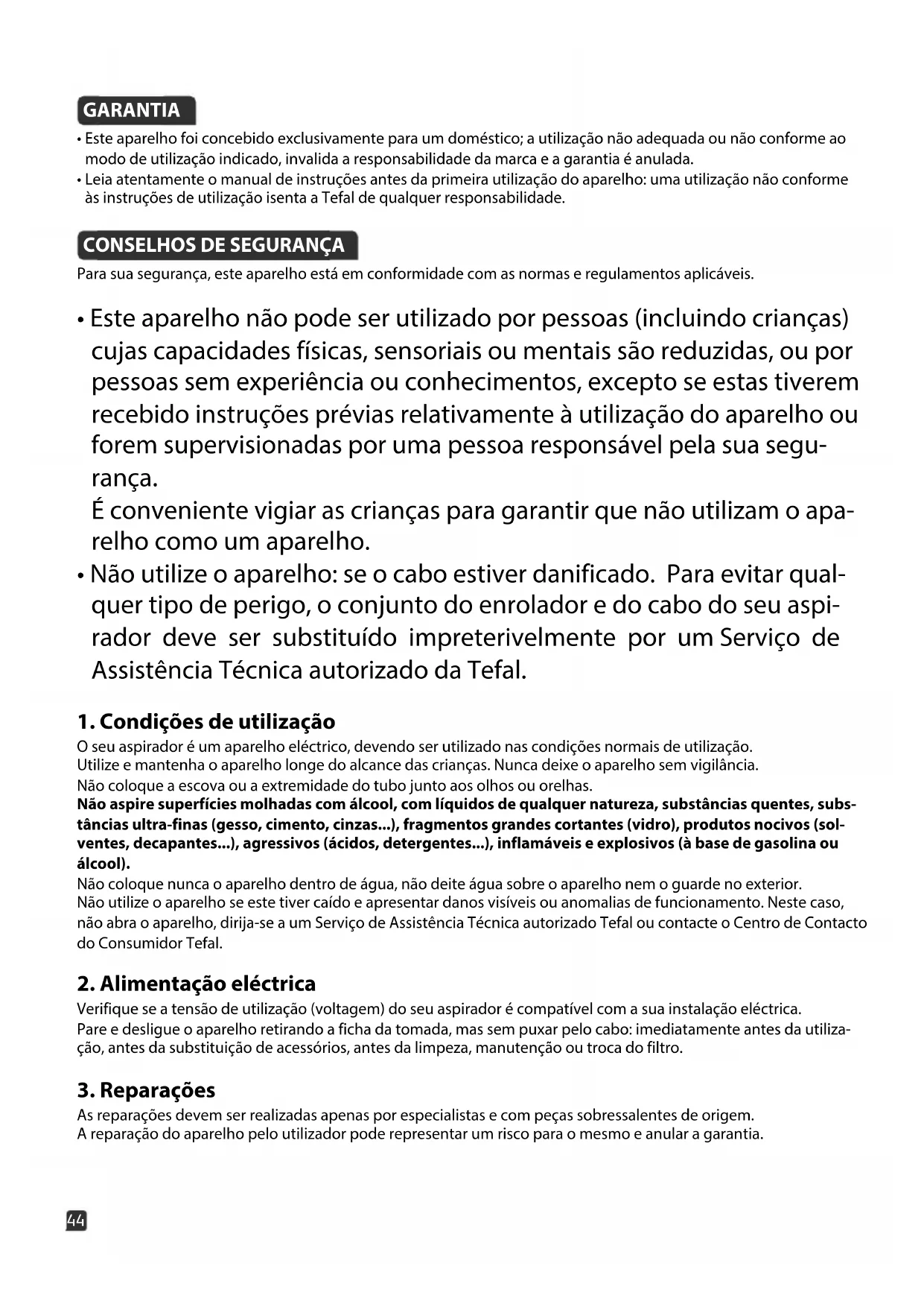 O seu aspirador é um aparelho eléctrico, devendo ser utilizado nas condições normais de utilização. Utilize e mantenha o aparelho longe do alcance das crianças. Nunca deixe o aparelho sem vigilância. Não coloque a escova ou a extremidade do tubo junto aos olhos ou orelhas. Não aspire superfícies molhadas com álcool, com líquidos de qualquer natureza, substâncias quentes, subs- tâncias ultra-finas (gesso, cimento, cinzas...), fragmentos grandes cortantes (vidro), produtos nocivos (sol- ventes, decapantes...), agressivos (ácidos, detergentes...), inflamáveis e explosivos (à base de gasolina ou álcool). Não coloque nunca o aparelho dentro de água, não deite água sobre o aparelho nem o guarde no exterior. Não utilize o aparelho se este tiver caído e apresentar danos visíveis ou anomalias de funcionamento. Neste caso, não abra o aparelho, dirija-se a um Serviço de Assistência Técnica autorizado Tefal ou contacte o Centro de Contacto do Consumidor Tefal.