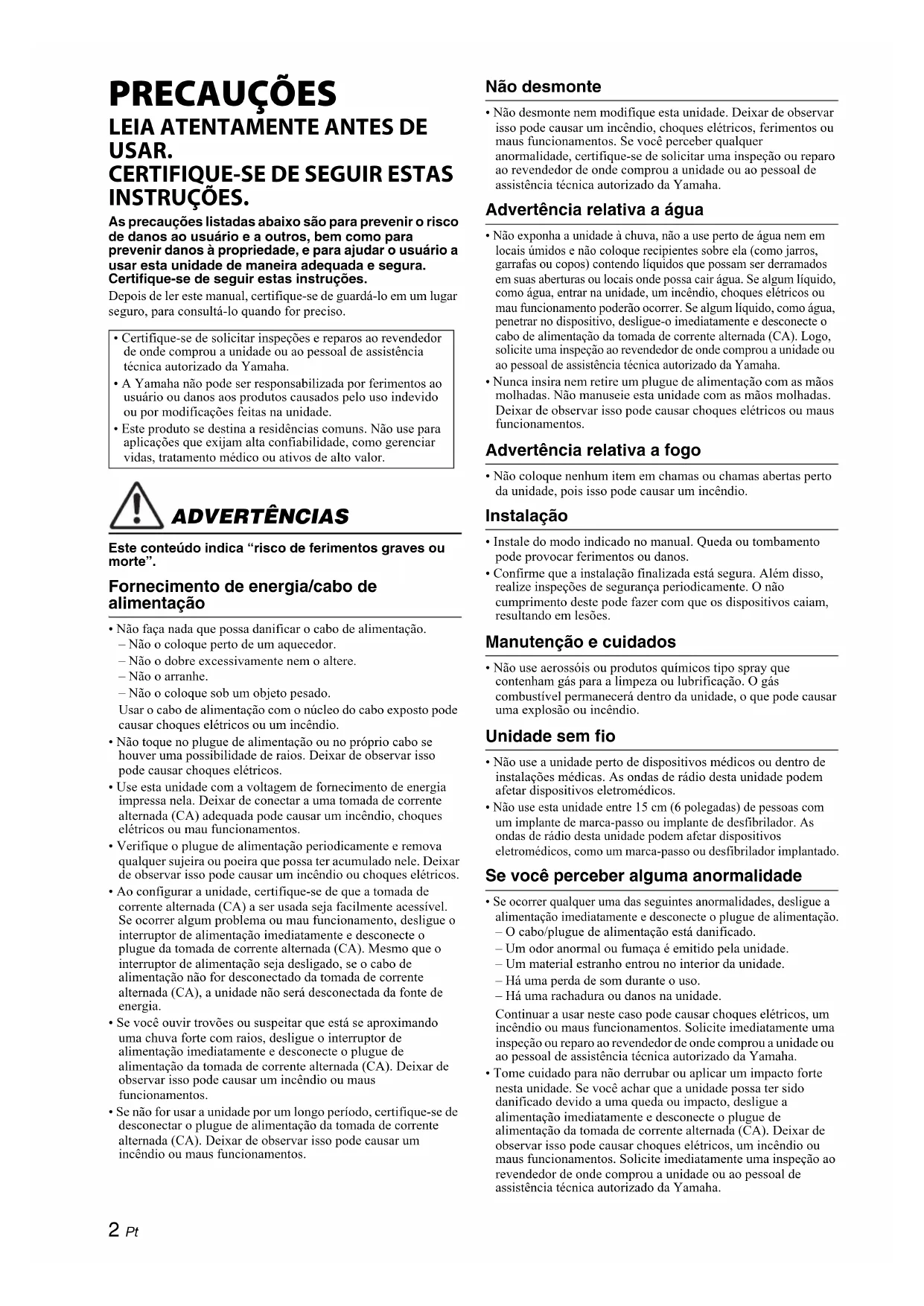 - A Yamaha não pode ser responsabilizada por ferimentos ao usuário ou danos aos produtos causados pelo uso indevido ou por modificações feitas na unidade.
