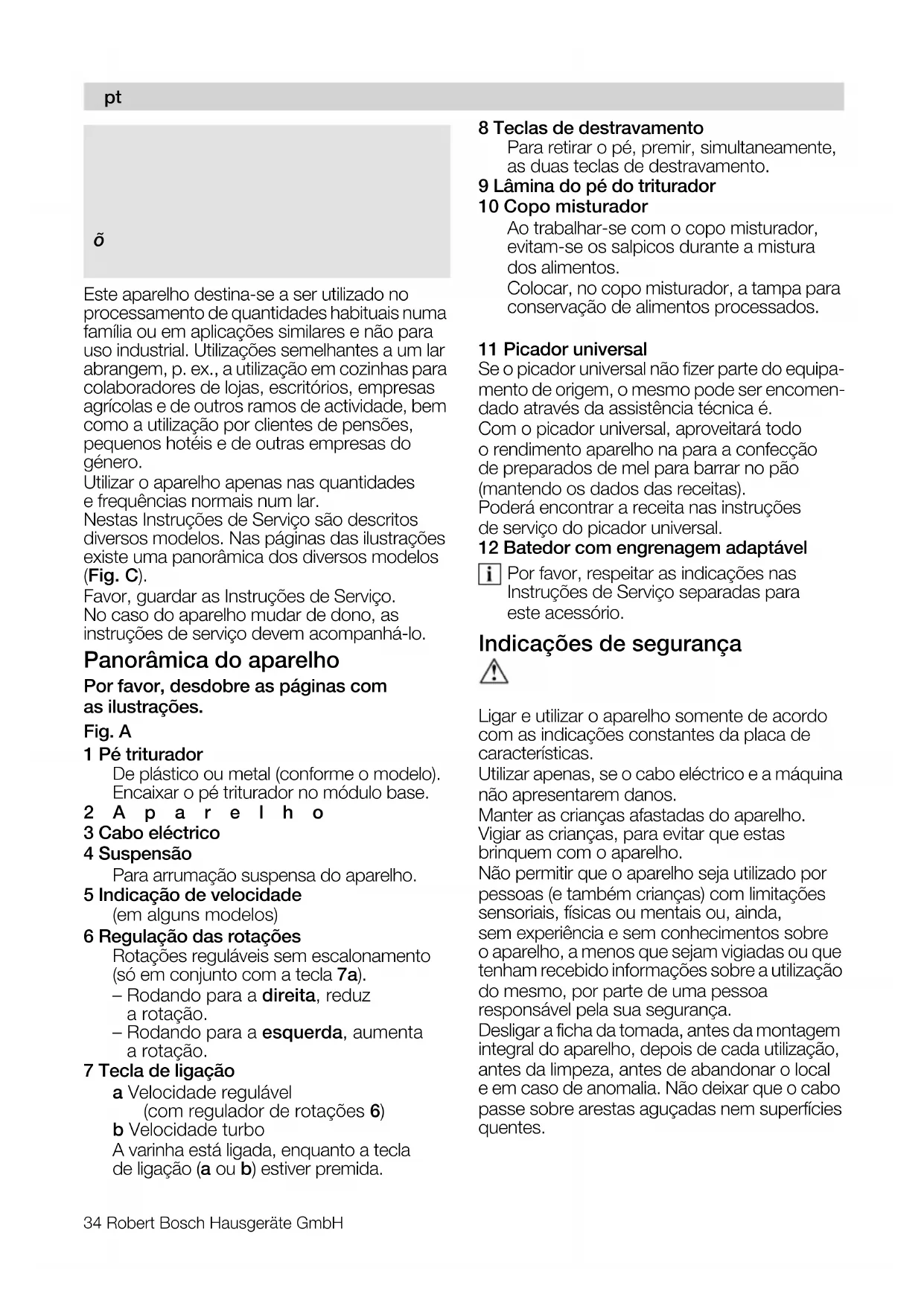 Nos reservamos el derecho de introducir modificaciones.34 Robert Bosch Hausgeräte GmbH Este aparelho destina-se a ser utilizado no processamento de quantidades habituais numa família ou em aplicações similares e não para uso industrial. Utilizações semelhantes a um lar abrangem, p. ex., a utilização em cozinhas para colaboradores de lojas, escritórios, empresas agrícolas e de outros ramos de actividade, bem como a utilização por clientes de pensões, pequenos hotéis e de outras empresas do género. Utilizar o aparelho apenas nas quantidades e frequências normais num lar. Nestas Instruções de Serviço são descritos diversos modelos. Nas páginas das ilustrações existe uma panorâmica dos diversos modelos (Fig. C). Favor, guardar as Instruções de Serviço. No caso do aparelho mudar de dono, as instruções de serviço devem acompanhá-lo. Panorâmica do aparelho Por favor, desdobre as páginas com as ilustrações. Fig. A 1 Pé triturador De plástico ou metal (conforme o modelo). Encaixar o pé triturador no módulo base. 2Aparelho 3 Cabo eléctrico 4 Suspensão Para arrumação suspensa do aparelho. 5 Indicação de velocidade (em alguns modelos) 6 Regulação das rotações Rotações reguláveis sem escalonamento (só em conjunto com a tecla 7a). – Rodando para a direita, reduz a rotação. – Rodando para a esquerda, aumenta a rotação. 7 Tecla de ligação a Velocidade regulável (com regulador de rotações 6) b Velocidade turbo A varinha está ligada, enquanto a tecla de ligação (a ou b) estiver premida. 8 Teclas de destravamento Para retirar o pé, premir, simultaneamente, as duas teclas de destravamento. 9 Lâmina do pé do triturador 10 Copo misturador Ao trabalhar-se com o copo misturador, evitam-se os salpicos durante a mistura dos alimentos. Colocar, no copo misturador, a tampa para conservação de alimentos processados. bã=~äÖìåë=ãçÇÉäçëW 11 Picador universal Se o picador universal não fizer parte do equipa- mento de origem, o mesmo pode ser encomen- dado através da assistência técnica é. Com o picador universal, aproveitará todo o rendimento aparelho na para a confecção de preparados de mel para barrar no pão (mantendo os dados das receitas). Poderá encontrar a receita nas instruções de serviço do picador universal. 12 Batedor com engrenagem adaptável Por favor, respeitar as indicações nas Instruções de Serviço separadas para este acessório. Indicações de segurança mÉêáÖç=ÇÉ=ÑÉêáãÉåíçë mÉêáÖç=ÇÉ=ÅÜçèìÉ=Éä¨ÅíêáÅç Ligar e utilizar o aparelho somente de acordo com as indicações constantes da placa de características. Utilizar apenas, se o cabo eléctrico e a máquina não apresentarem danos. Manter as crianças afastadas do aparelho. Vigiar as crianças, para evitar que estas brinquem com o aparelho. Não permitir que o aparelho seja utilizado por pessoas (e também crianças) com limitações sensoriais, físicas ou mentais ou, ainda, sem experiência e sem conhecimentos sobre o aparelho, a menos que sejam vigiadas ou que tenham recebido informações sobre a utilização do mesmo, por parte de uma pessoa responsável pela sua segurança. Desligar a ficha da tomada, antes da montagem integral do aparelho, depois de cada utilização, antes da limpeza, antes de abandonar o local e em caso de anomalia. Não deixar que o cabo passe sobre arestas aguçadas nem superfícies quentes.