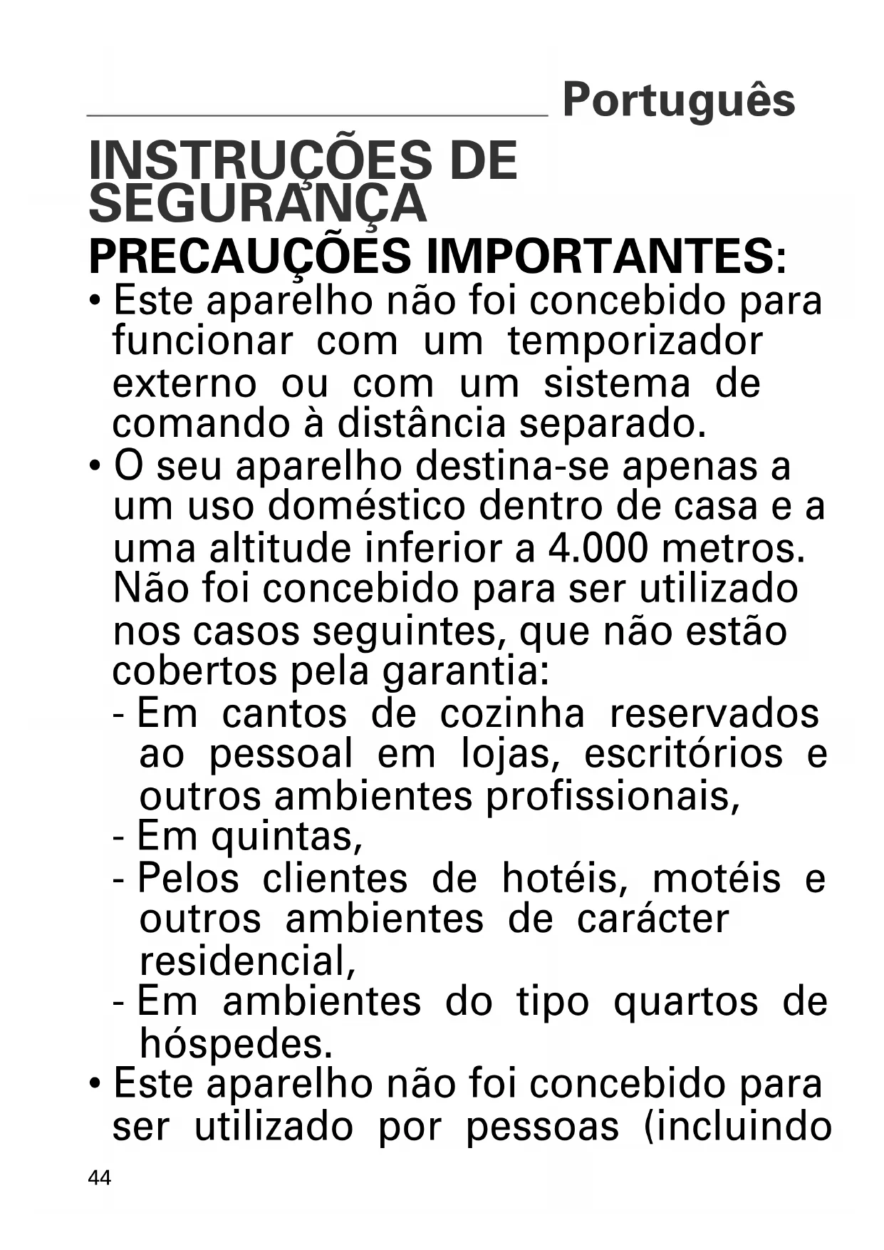 - Este aparelho não foi concebido para ser utilizado por pessoas (incluindo45 crianças) cujas capacidades físicas, sensoriais ou mentais se encontram reduzidas, ou por pessoas com falta de experiência ou conhecimento, a não ser que tenham sido devidamente acompanhadas e instruídas sobre a correcta utilização do aparelho, pela pessoa responsável pela sua segurança.