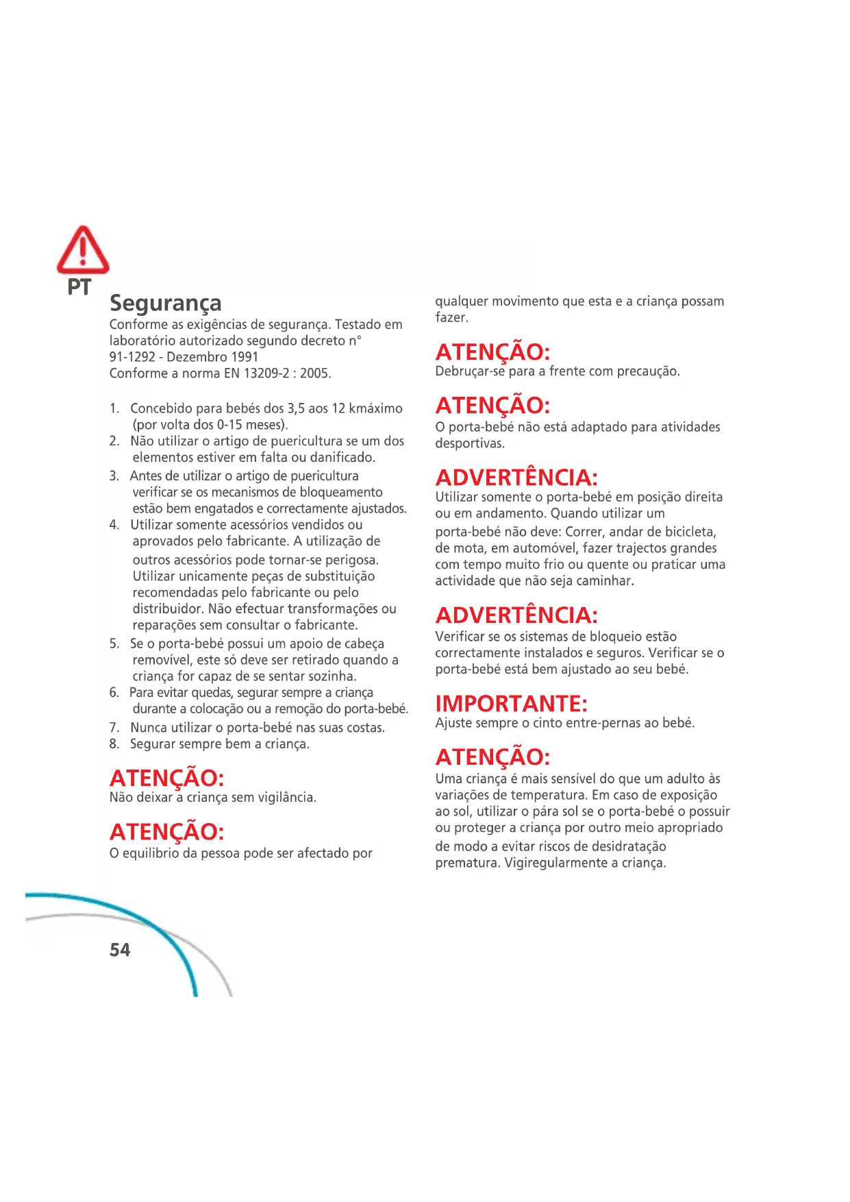 Segurança Conforme as exigências de segurança. Testado em laboratório autorizado segundo decreto n° 91-1292 - Dezembro 1991Conforme a norma EN 13209-2 : 2005. 1. Concebido para bebés dos 3,5 aos 12 kmáximo (por volta dos 0-15 meses). 2. Não utilizar o artigo de puericultura se um dos elementos estiver em falta ou danificado. 3. Antes de utilizar o artigo de puericultura verificar se os mecanismos de bloqueamento estão bem engatados e correctamente ajustados. 4. Utilizar somente acessórios vendidos ou aprovados pelo fabricante. A utilização de outros acessórios pode tornar-se perigosa. Utilizar unicamente peças de substituição recomendadas pelo fabricante ou pelo distribuidor. Não efectuar transformações ou reparações sem consultar o fabricante. 5. Se o porta-bebé possui um apoio de cabeça removível, este só deve ser retirado quando a criança for capaz de se sentar sozinha.6. Para evitar quedas, segurar sempre a criança durante a colocação ou a remoção do porta-bebé.7. Nunca utilizar o porta-bebé nas suas costas.8. Segurar sempre bem a criança. ATENÇÃO: Não deixar a criança sem vigilância. ATENÇÃO: O equilibrio da pessoa pode ser afectado por qualquer movimento que esta e a criança possam fazer. ATENÇÃO: Debruçar-se para a frente com precaução. ATENÇÃO: O porta-bebé não está adaptado para atividades desportivas. ADVERTÊNCIA: Utilizar somente o porta-bebé em posição direita ou em andamento. Quando utilizar um porta-bebé não deve: Correr, andar de bicicleta, de mota, em automóvel, fazer trajectos grandes com tempo muito frio ou quente ou praticar uma actividade que não seja caminhar. ADVERTÊNCIA: Verificar se os sistemas de bloqueio estão correctamente instalados e seguros. Verificar se o porta-bebé está bem ajustado ao seu bebé. IMPORTANTE: Ajuste sempre o cinto entre-pernas ao bebé. ATENÇÃO: Uma criança é mais sensível do que um adulto às variações de temperatura. Em caso de exposição ao sol, utilizar o pára sol se o porta-bebé o possuir ou proteger a criança por outro meio apropriado de modo a evitar riscos de desidratação prematura. Vigiregularmente a criança.