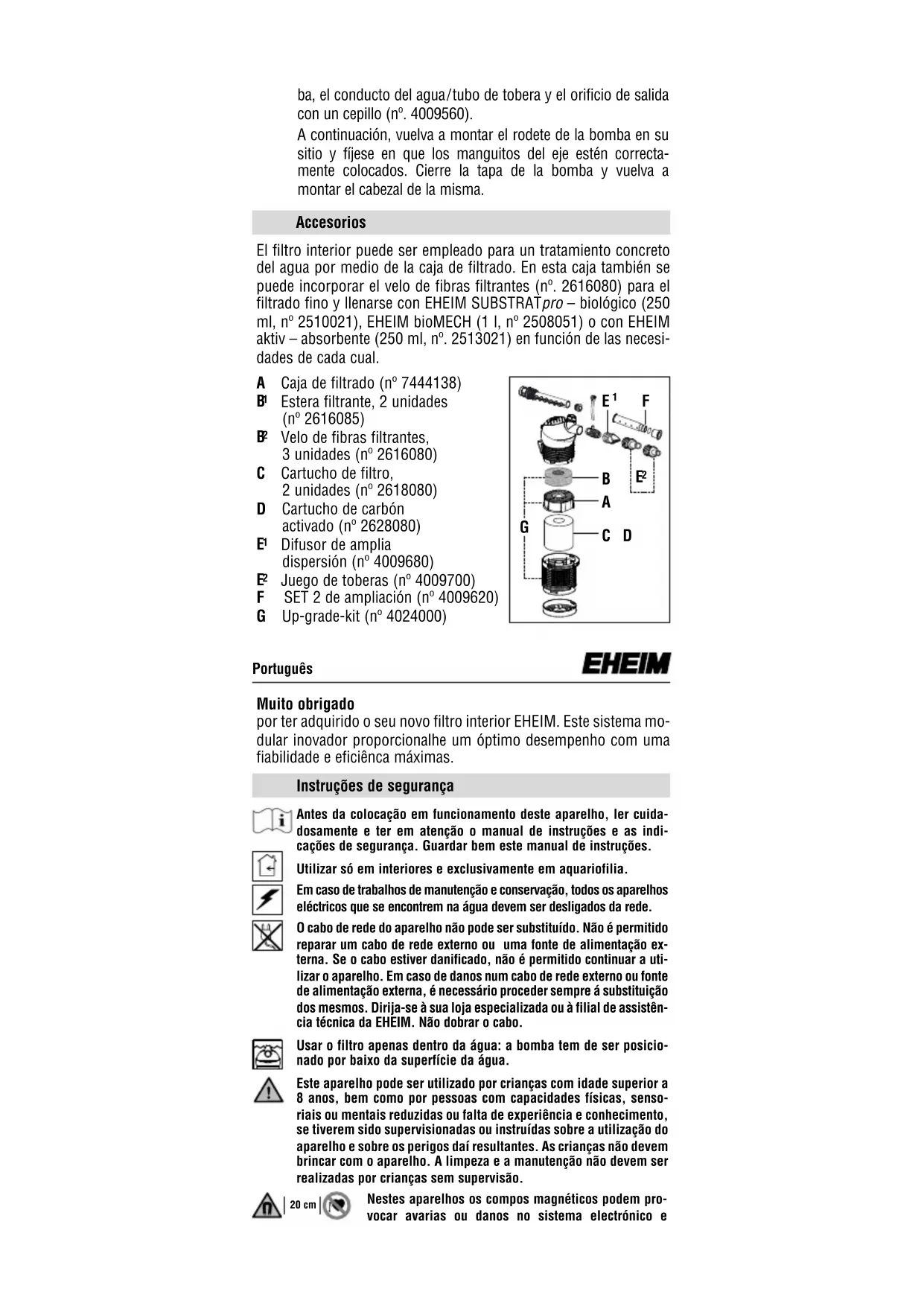 Juego de toberas (nº 4009700) F SET 2 de ampliación (nº 4009620) G Up-grade-kit (nº 4024000) Accesorios Muito obrigado por ter adquirido o seu novo filtro interior EHEIM. Este sistema mo- dular inovador proporcionalhe um óptimo desempenho com uma fiabilidade e eficiênca máximas. Português Instruções de segurança
