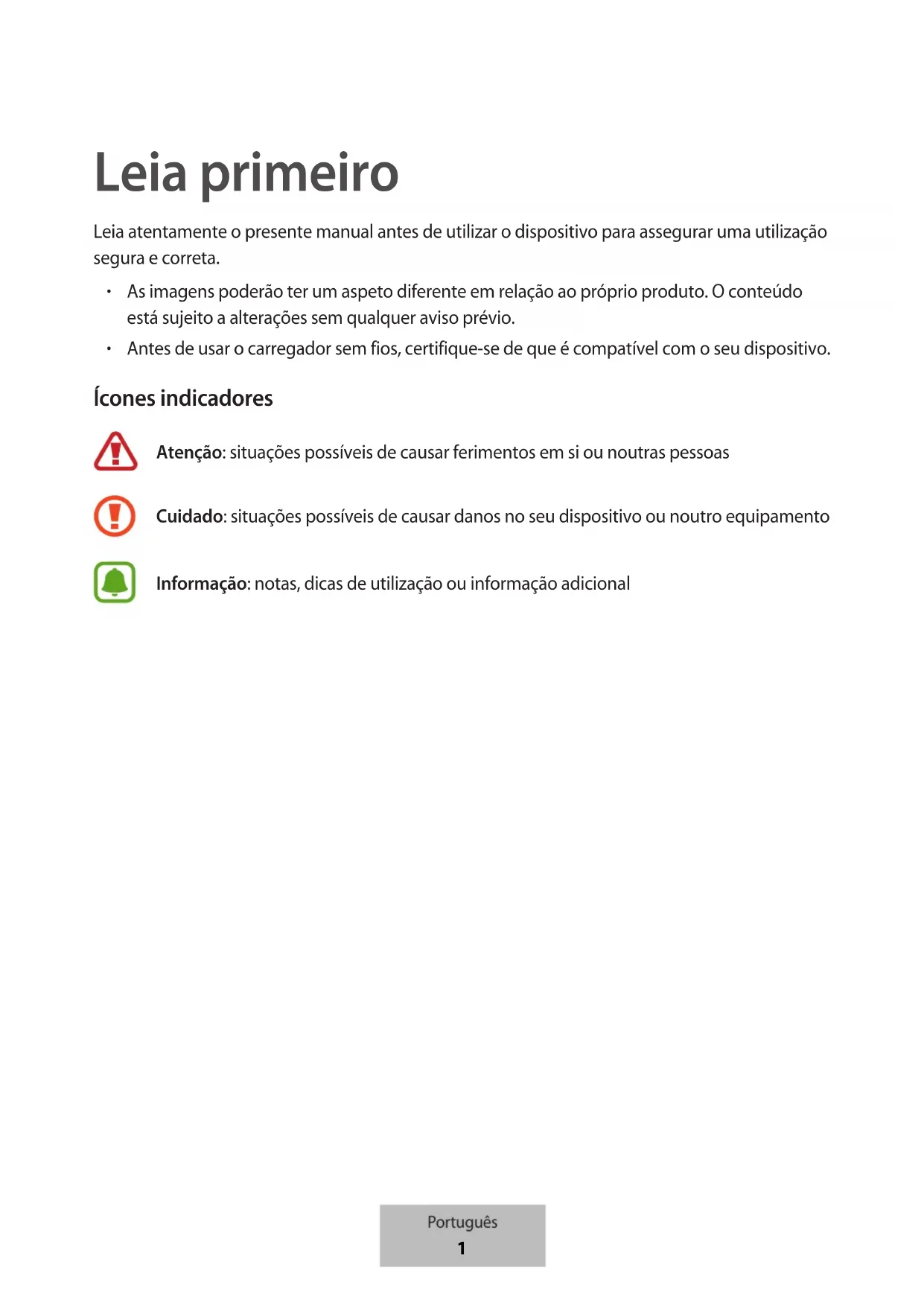Antes de usar o carregador sem fios, certifique-se de que é compatível com o seu dispositivo. Ícones indicadores Atenção: situações possíveis de causar ferimentos em si ou noutras pessoas Cuidado: situações possíveis de causar danos no seu dispositivo ou noutro equipamento Informação: notas, dicas de utilização ou informação adicional Português