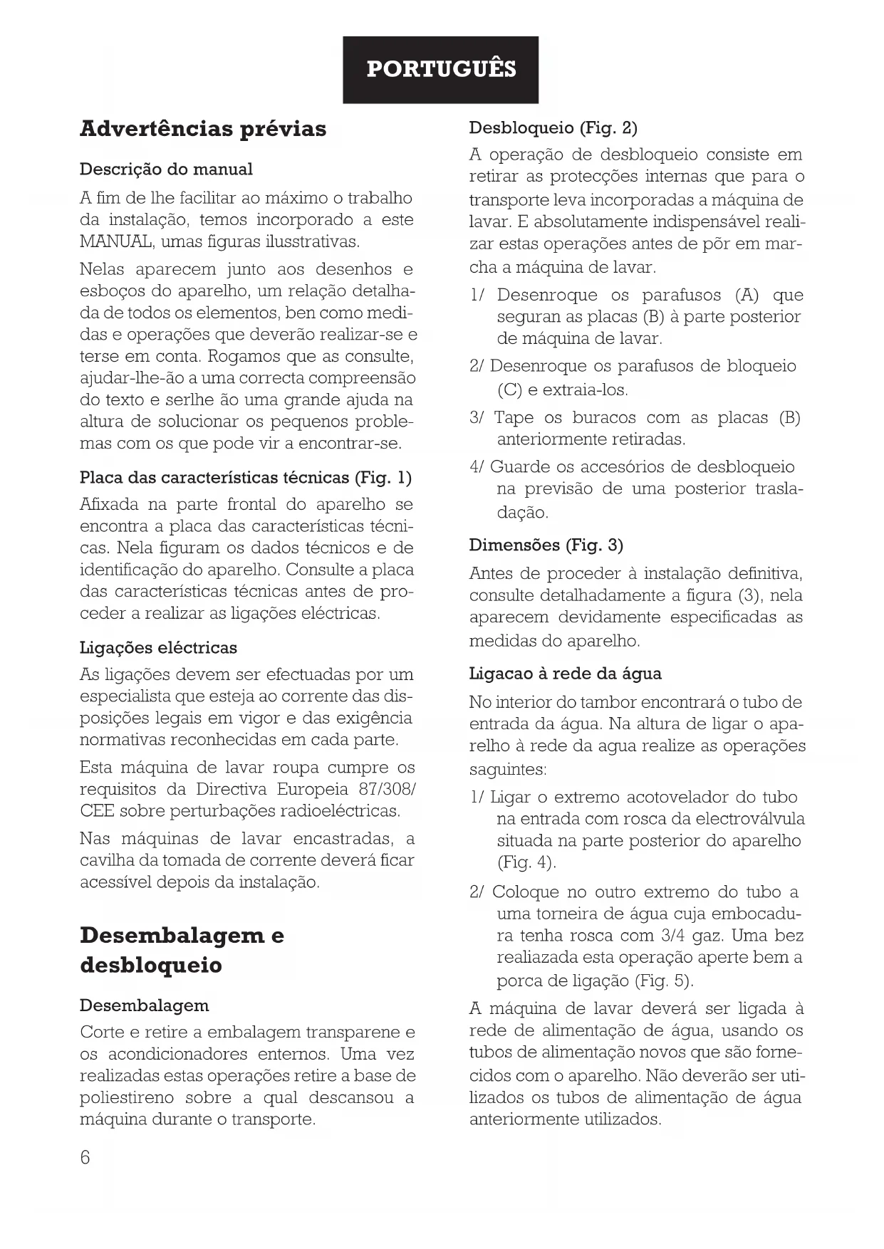 FRANÇAISAdvertências prévias Descrição do manual A fim de lhe facilitar ao máximo o trabalho da instalação, temos incorporado a este MANUAL, umas figuras ilusstrativas. Nelas aparecem junto aos desenhos e esboços do aparelho, um relação detalha- da de todos os elementos, ben como medi- das e operações que deverão realizar-se e terse em conta. Rogamos que as consulte, ajudar-lhe-ão a uma correcta compreensão do texto e serlhe ão uma grande ajuda na altura de solucionar os pequenos proble- mas com os que pode vir a encontrar-se. Placa das características técnicas (Fig. 1) Afixada na parte frontal do aparelho se encontra a placa das características técni- cas. Nela figuram os dados técnicos e de identificação do aparelho. Consulte a placa das características técnicas antes de pro- ceder a realizar as ligações eléctricas. Ligações eléctricas As ligações devem ser efectuadas por um especialista que esteja ao corrente das dis- posições legais em vigor e das exigência normativas reconhecidas em cada parte. Esta máquina de lavar roupa cumpre os requisitos da Directiva Europeia 87/308/ CEE sobre perturbações radioeléctricas. Nas máquinas de lavar encastradas, a cavilha da tomada de corrente deverá ficar acessível depois da instalação. Desembalagem e desbloqueio Desembalagem Corte e retire a embalagem transparene e os acondicionadores enternos. Uma vez realizadas estas operações retire a base de poliestireno sobre a qual descansou a máquina durante o transporte. Desbloqueio (Fig. 2) A operação de desbloqueio consiste em retirar as protecções internas que para o transporte leva incorporadas a máquina de lavar. E absolutamente indispensável reali- zar estas operações antes de põr em mar- cha a máquina de lavar. 1/ Desenroque os parafusos (A) que seguran as placas (B) à parte posterior de máquina de lavar. 2/ Desenroque os parafusos de bloqueio (C) e extraia-los. 3/ Tape os buracos com as placas (B) anteriormente retiradas. 4/ Guarde os accesórios de desbloqueio na previsão de uma posterior trasla- dação. Dimensões (Fig. 3) Antes de proceder à instalação definitiva, consulte detalhadamente a figura (3), nela aparecem devidamente especificadas as medidas do aparelho. Ligacao à rede da água No interior do tambor encontrará o tubo de entrada da água. Na altura de ligar o apa- relho à rede da agua realize as operações saguintes: 1/ Ligar o extremo acotovelador do tubo na entrada com rosca da electroválvula situada na parte posterior do aparelho (Fig. 4). 2/ Coloque no outro extremo do tubo a uma torneira de água cuja embocadu- ra tenha rosca com 3/4 gaz. Uma bez realiazada esta operação aperte bem a porca de ligação (Fig. 5). A máquina de lavar deverá ser ligada à rede de alimentação de água, usando os tubos de alimentação novos que são forne- cidos com o aparelho. Não deverão ser uti- lizados os tubos de alimentação de água anteriormente utilizados.