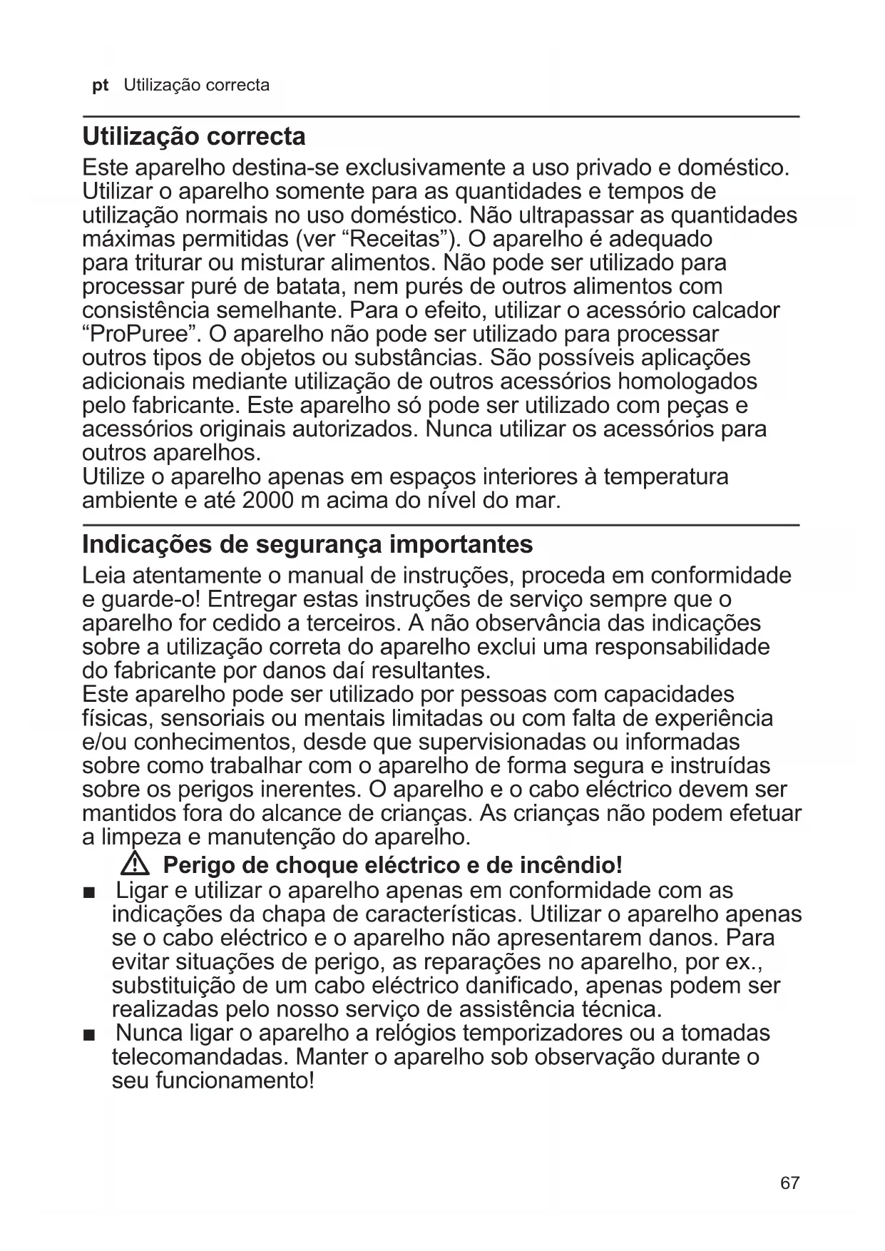 - trodomésticos) que le acredita como Servicio Autorizado de Bosch. Reservado el derecho a cambios y modicaciones sin previo aviso.67 pt Utilização correcta Utilização correcta Este aparelho destina-se exclusivamente a uso privado e doméstico. Utilizar o aparelho somente para as quantidades e tempos de utilização normais no uso doméstico. Não ultrapassar as quantidades máximas permitidas (ver “Receitas”). O aparelho é adequado para triturar ou misturar alimentos. Não pode ser utilizado para processar puré de batata, nem purés de outros alimentos com consistência semelhante. Para o efeito, utilizar o acessório calcador “ProPuree”. O aparelho não pode ser utilizado para processar outros tipos de objetos ou substâncias. São possíveis aplicações adicionais mediante utilização de outros acessórios homologados pelo fabricante. Este aparelho só pode ser utilizado com peças e acessórios originais autorizados. Nunca utilizar os acessórios para outros aparelhos. Utilize o aparelho apenas em espaços interiores à temperatura ambiente e até 2000 m acima do nível do mar. Indicações de segurança importantes Leia atentamente o manual de instruções, proceda em conformidade e guarde-o! Entregar estas instruções de serviço sempre que o aparelho for cedido a terceiros. A não observância das indicações sobre a utilização correta do aparelho exclui uma responsabilidade do fabricante por danos daí resultantes. Este aparelho pode ser utilizado por pessoas com capacidades físicas, sensoriais ou mentais limitadas ou com falta de experiência e/ou conhecimentos, desde que supervisionadas ou informadas sobre como trabalhar com o aparelho de forma segura e instruídas sobre os perigos inerentes. O aparelho e o cabo eléctrico devem ser mantidos fora do alcance de crianças. As crianças não podem efetuar a limpeza e manutenção do aparelho. W Perigo de choque eléctrico e de incêndio! ■ Ligar e utilizar o aparelho apenas em conformidade com as indicações da chapa de características. Utilizar o aparelho apenas se o cabo eléctrico e o aparelho não apresentarem danos. Para evitar situações de perigo, as reparações no aparelho, por ex., substituição de um cabo eléctrico danificado, apenas podem ser realizadas pelo nosso serviço de assistência técnica. ■ Nunca ligar o aparelho a relógios temporizadores ou a tomadas telecomandadas. Manter o aparelho sob observação durante o seu funcionamento!68 pt Indicações de segurança importantes ■ Não colocar o aparelho sobre ou na proximidade de superfícies quentes, como por exemplo placas de fogão. Não permitir que o cabo de alimentação toque em peças quentes nem o puxar sobre arestas vivas. ■ Nunca mergulhar o aparelho base em líquidos, não colocá-lo sob água corrente nem lavá-lo na máquina de lavar loiça. Nunca utilizar aparelhos de limpeza a vapor. Não utilizar o aparelho com as mãos húmidas ou molhadas. ■ Se o seu aparelho cair em água ou noutro líquido, não é permitido continuar a utilizar o aparelho. ■ Mergulhar o pé triturador no máximo até à marcação Í nos alimentos, caso contrário há perigo de choque elétrico! ■ Desligue o aparelho da corrente após cada utilização, sempre que fique sem vigilância, antes de se montar, desmontar ou limpar, e em caso de anomalia. W Perigo de ferimentos! ■ Desligar o aparelho da corrente após cada utilização, sempre que fique sem vigilância, antes de se montar, desmontar ou limpar, e em caso de anomalia. ■ Depois de desligado, o acionamento ainda gira por breves instan- tes Aguardar que o acionamento esteja completamente parado. ■ Nunca tocar na lâmina do pé triturador. Nunca limpar a lâmina do pé triturador com as mãos sem qualquer protecção. W Perigo de queimaduras! Cuidado ao processar alimentos quentes. Os alimentos quentes podem salpicar durante o processamento. W Risco de sufoco! Não permitir a crianças brincar com o material de embalagem. W Atenção! ■ Recomenda-se que o aparelho nunca fique ligado mais tempo do que o necessário para a preparação dos alimentos. Não utilizar em vazio. ■ O copo misturador não é adequado para utilização no microondas. ■ Nunca colocar o pé triturador sobre superfícies quentes nem utilizá-lo em alimentos muito quentes. Antes de processar, deixar arrefecer os alimentos a ferver para pelo menos 80°C. Para utilizar a varinha dentro da panela, retirar primeiro a panela do bico do fogão. W Importante! É impreterível limpar cuidadosamente o aparelho após cada utilização ou após um longo período de não utilização. X “Conservação e limpeza diária” ver página 7169 pt Índice Muitos parabéns por ter comprado um novo aparelho da marca Bosch. Na nossa página da Internet poderá encontrar mais informações sobre os nossos produtos. Relativamente à utilização deste manual de instruções: as páginas de contracapa destas instruções são desdobráveis. Aí encontram-se ilustrações assinaladas com letras e números que são mencionados recorrentemente nestas instruções (por ex. X Sequência de imagens B). Índice Utilização correcta p. 67