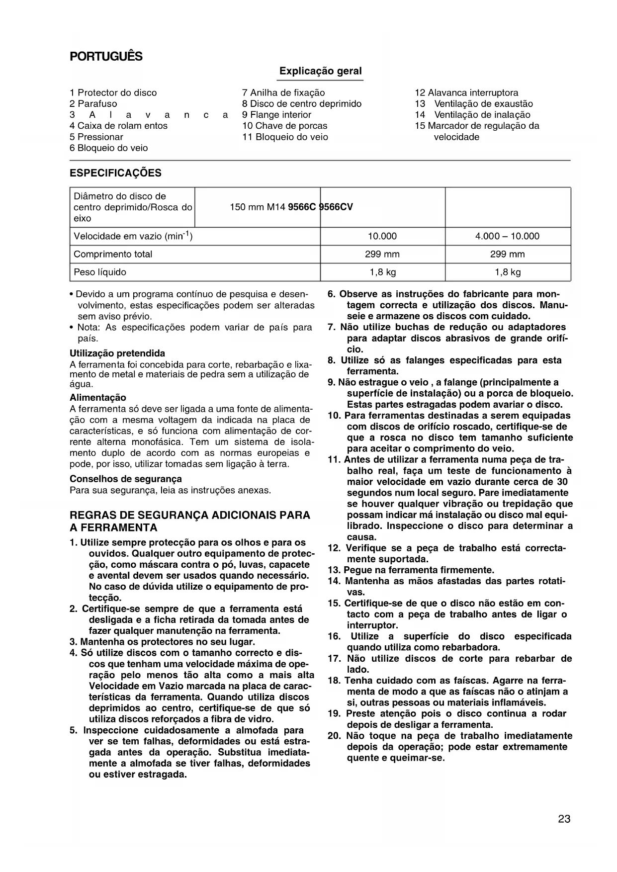 depois da operação; pode estar extremamente quente e queimar-se. Diâmetro do disco de centro deprimido/Rosca do eixo 150 mm M14 9566C 9566CV Velocidade em vazio (min