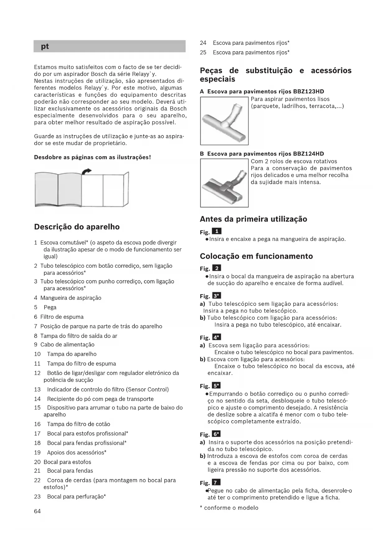 - Según equipamiento64 Estamos muito satisfeitos com o facto de se ter decidi- do por um aspirador Bosch da série Relayy`y. Nestas instruções de utilização, são apresentados di- ferentes modelos Relayy`y. Por este motivo, algumas características e funções do equipamento descritas poderão não corresponder ao seu modelo. Deverá uti- lizar exclusivamente os acessórios originais da Bosch especialmente desenvolvidos para o seu aparelho, para obter melhor resultado de aspiração possível. Guarde as instruções de utilização e junte-as ao aspira- dor se este mudar de proprietário. Desdobre as páginas com as ilustrações! Descrição do aparelho 1 Escova comutável* (o aspeto da escova pode divergir da ilustração apesar de o modo de funcionamento ser igual) 2 Tubo telescópico com botão corrediço, sem ligação para acessórios* 3 Tubo telescópico com punho corrediço, com ligação para acessórios* 4 Mangueira de aspiração 5 Pega 6 Filtro de espuma 7 Posição de parque na parte de trás do aparelho 8 Tampa do filtro de saída do ar 9 Cabo de alimentação 10 Tampa do aparelho 11 Tampa do filtro de espuma 12 Botão de ligar/desligar com regulador eletrónico da potência de sucção 13 Indicador de controlo do filtro (Sensor Control) 14 Recipiente do pó com pega de transporte 15 Dispositivo para arrumar o tubo na parte de baixo do aparelho 16 Tampa do filtro de cotão 17 Bocal para estofos profissional* 18 Bocal para fendas profissional* 19 Apoios dos acessórios* 20 Bocal para estofos 21 Bocal para fendas 22 Coroa de cerdas (para montagem no bocal para estofos)* 23 Bocal para perfuração*