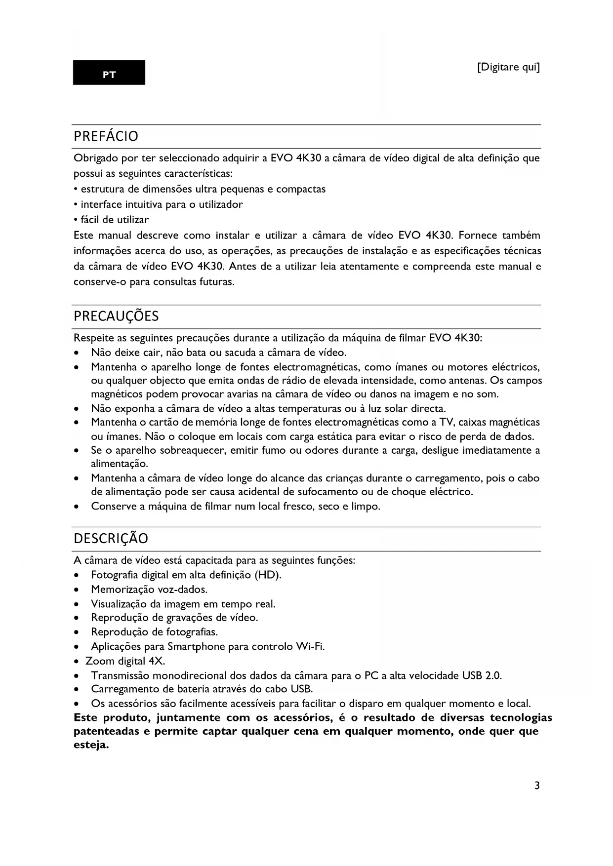 PREFÁCIO Obrigado por ter seleccionado adquirir a EVO 4K30 a câmara de vídeo digital de alta definição que possui as seguintes características: