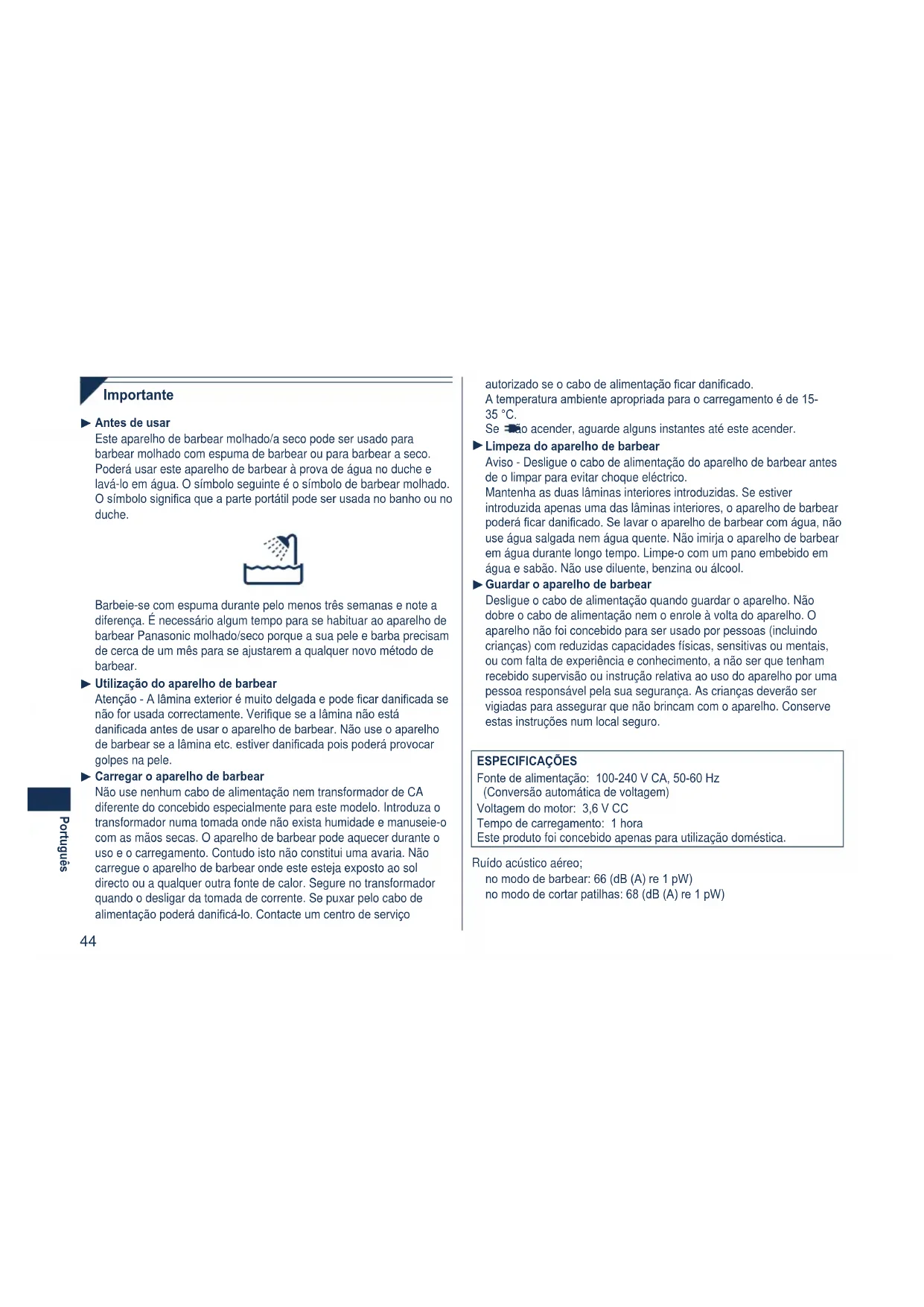 yderligere oplysninger. Oplysninger om afhændelse i lande uden for EU Dette symbol er kun gyldigt i EU. Hvis du ønsker at afhænde dette produkt, skal du rette henvendelse til de lokale myndigheder eller din forhandler . Her kan du få oplysninger om, hvordan du bedst kommer af med produktet.44 Português Importante Antes de usar Este aparelho de barbear molhado/a seco pode ser usado para barbear molhado com espuma de barbear ou para barbear a seco. Poderá usar este aparelho de barbear à prova de água no duche e lavá-lo em água. O símbolo seguinte é o símbolo de barbear molhado. O símbolo signica que a parte portátil pode ser usada no banho ou no duche. Barbeie-se com espuma durante pelo menos três semanas e note a diferença. É necessário algum tempo para se habituar ao aparelho de barbear Panasonic molhado/seco porque a sua pele e barba precisam de cerca de um mês para se ajustarem a qualquer novo método de barbear. Utilização do aparelho de barbear Atenção - A lâmina exterior é muito delgada e pode car danicada se não for usada correctamente. Verique se a lâmina não está danicada antes de usar o aparelho de barbear. Não use o aparelho de barbear se a lâmina etc. estiver danicada pois poderá provocar golpes na pele. Carregar o aparelho de barbear Não use nenhum cabo de alimentação nem transformador de CA diferente do concebido especialmente para este modelo. Introduza o transformador numa tomada onde não exista humidade e manuseie-o com as mãos secas. O aparelho de barbear pode aquecer durante o uso e o carregamento. Contudo isto não constitui uma avaria. Não carregue o aparelho de barbear onde este esteja exposto ao sol directo ou a qualquer outra fonte de calor. Segure no transformador quando o desligar da tomada de corrente. Se puxar pelo cabo de alimentação poderá danicá-lo. Contacte um centro de serviço