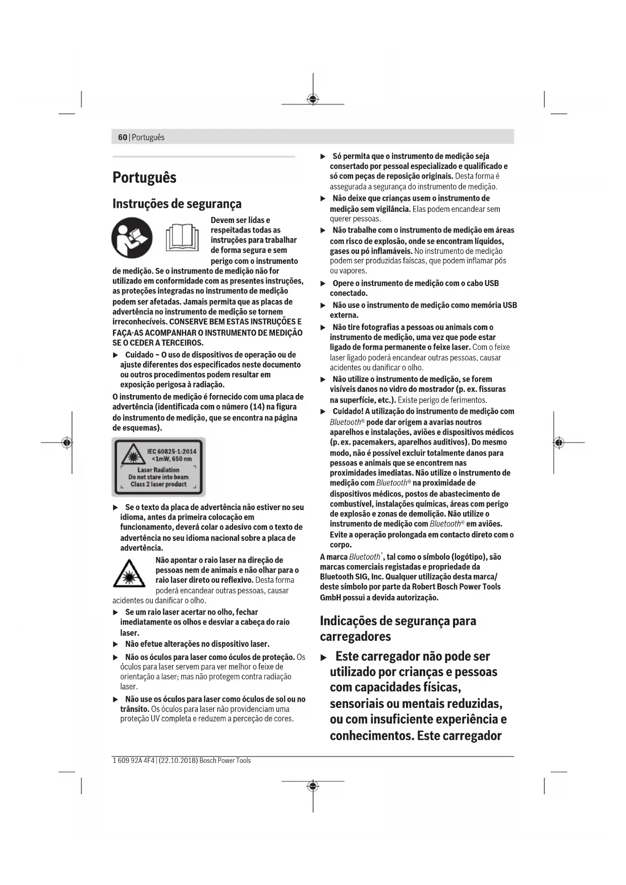 estabelecer uma ligação, conforme o modelo e o sistema operativo. Os aparelhos Bluetooth® têm de suportar o perfil GATT. Uma longa autonomia de funcionamento da bateria é alcançada através de medidas economizadoras de energia p. ex. desativação da função Bluetooth®, se esta não for necessária ou redução da luminosidade do mostrador etc. Para uma identificação inequívoca do seu instrumento de medição, consulte o número de série (15) na placa de características. Primeira colocação em funcionamento Carregar a bateria u Utilize apenas os carregadores listados nos dados técnicos. Só estes carregadores são apropriados para as baterias de lítio utilizados para o seu instrumento de medição. u A utilização de carregadores de outros fabricantes pode causar defeitos no instrumento de medição; também uma tensão mais elevada (p. ex. 12V) de um carregador de automóvel não é adequada para carregar este instrumento de medição. Em caso de inobservância, a garantia perde a validade. u Observar a tensão de rede! A tensão da fonte de corrente deve coincidir com a chapa de características do carregador. Nota: A bateria é fornecida parcialmente carregada. Para garantir o desempenho máximo da bateria, carregue a bateria totalmente antes da primeira utilização. Nota: A tomada Micro-USB(16) para ligação do cabo Micro- USB (22) encontra-se na cobertura do pino de medição (8). Para abrir a cobertura, pressione o botão de disparo (7). A bateria de iões de lítio pode ser carregada a qualquer altura, sem que a sua vida útil seja reduzida. Uma interrupção do processo de carga não danifica a bateria. Se o segmento inferior do indicador do nível de carga da bateria (g) piscar, já só podem ser efetuadas poucas medições. Carregar a bateria. Se a armação em redor dos segmentos do indicador do nível de carga da bateria (g) piscar, deixa de ser possível efetuar medições. O instrumento de medição só pode ser utilizado durante um breve período de tempo (p. ex. para verificar entradas da lista de valores de medição). Carregar a bateria. Ligue o instrumento de medição através do cabo Micro- USB(22) fornecido ao carregador (23). Ligue o carregador (23) à tomada. O processo de carga começa. O indicador do nível de carga da bateria (g) mostra o processo de carregamento. Durante o processo de carga os segmentos piscam um após o outro. Se forem exibidos todos os segmentos do indicador do nível de carga da bateria (g) então a bateria está carregada por completo. Em caso de um período de não utilização prolongado, separe o carregador da rede elétrica. Adicionalmente, a bateria também pode ser carregada numa porta USB. Para tal, conecte o instrumento de medição com o micro cabo USB a uma porta USB. Em caso de funcionamento com USB (modo de carregamento, transmissão de dados), o tempo de carregamento pode ser consideravelmente prolongado. O instrumento de medição não pode ser utilizado de forma independente durante o processo de carregamento. O Bluetooth® desliga-se durante o processo de carregamento. As ligações existentes com outros aparelhos são interrompidas. Nesta ocasião, os dados podem perder- se. Notas para o manuseamento ideal da bateria no instrumento de medição Armazene o instrumento de medição apenas na faixa de temperatura permitida, (ver "Dados técnicos", Página62). Não deixe o instrumento de medição, p. ex., dentro do carro no Verão. Um período de funcionamento reduzido após o carregamento, indica que a bateria está gasta e que deve ser substituída pelo serviço de assistência técnica da Bosch. Observe as indicações sobre a eliminação de forma ecológica. Funcionamento Colocação em funcionamento u Não deixe o instrumento de medição ligado sem vigilância e desligue o instrumento de medição após utilização. Outras pessoas poderiam ser cegadas pelo raio laser. Português | 63 Bosch Power Tools 1 609 92A 4F4 | (22.10.2018)64 | Português 1 609 92A 4F4 | (22.10.2018) Bosch Power Tools u Proteja o instrumento de medição da humidade e da radiação solar direta. u Não exponha o instrumento de medição a temperaturas extremas ou oscilações de temperatura. Não os deixe, p. ex., ficar durante muito tempo no automóvel. No caso de oscilações de temperatura maiores, deixe o instrumento de medição atingir a temperatura ambiente antes de o utilizar. No caso de temperaturas ou de oscilações de temperatura extremas é possível que a precisão do instrumento de medição seja prejudicada. u Evite quedas ou embates violentos com o instrumento de medição. Após severas influências externas no instrumento de medição, recomendamos que se proceda a um controlo de exatidão antes de prosseguir Controlo de exatidão do instrumento de medição. u O instrumento de medição está equipado com uma interface sem fio. Devem ser respeitadas as limitações de utilização locais, p. ex. em aviões ou hospitais. Ligar/desligar Durante o trabalho, certifique-se de que a lente recetora (20), a saída do feixe laser (18) e a câmara (19) não ficam fechadas ou tapadas, caso contrário, não é possível efetuar medições corretas. – Para ligar o instrumento de medição e o laser, prima brevemente a tecla de medição (2) dianteira ou lateral