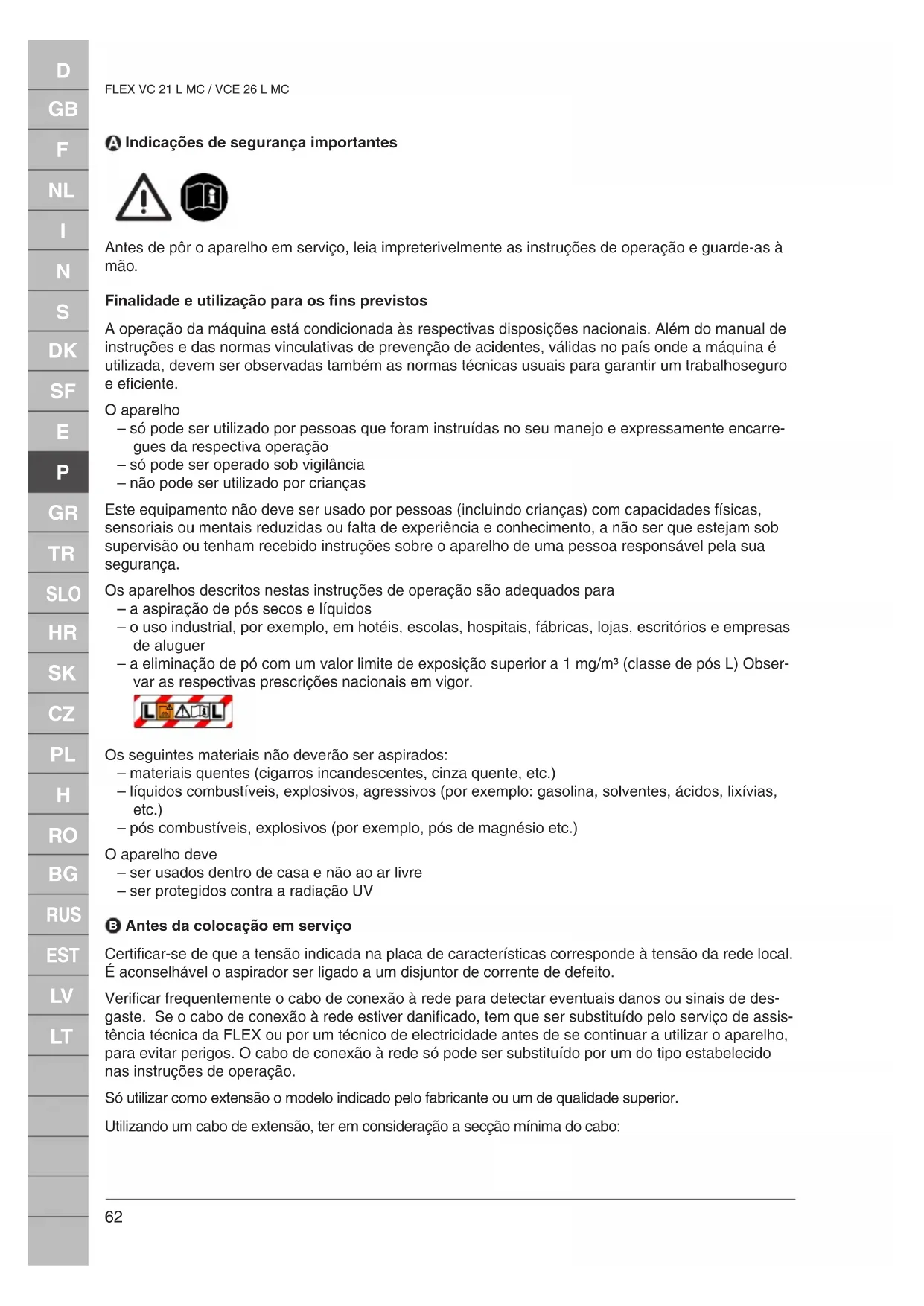 Antes da colocação em serviço Certificar-se de que a tensão indicada na placa de características corresponde à tensão da rede local. É aconselhável o aspirador ser ligado a um disjuntor de corrente de defeito. Verificar frequentemente o cabo de conexão à rede para detectar eventuais danos ou sinais de des- gaste. Se o cabo de conexão à rede estiver danificado, tem que ser substituído pelo serviço de assis- tência técnica da FLEX ou por um técnico de electricidade antes de se continuar a utilizar o aparelho, para evitar perigos. O cabo de conexão à rede só pode ser substituído por um do tipo estabelecido nas instruções de operação. Só utilizar como extensão o modelo indicado pelo fabricante ou um de qualidade superior. Utilizando um cabo de extensão, ter em consideração a secção mínima do cabo:D