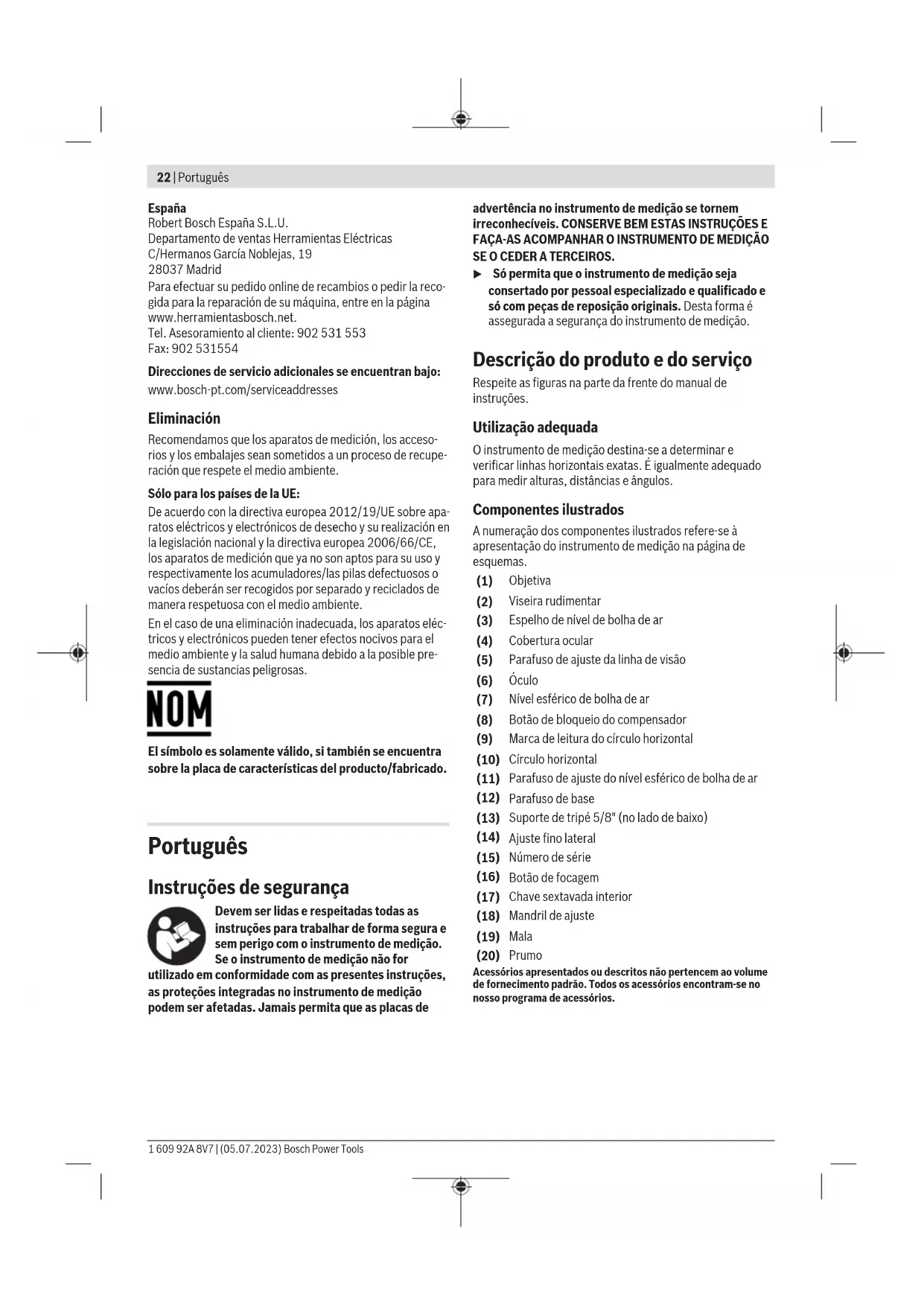 Divisão do círculo horizontal 1° 1grado 1° 1grado 1° 1grado Suporte de tripé 5/8" 5/8" 5/8" 5/8" 5/8" 5/8" Peso conforme EPTA-Procedure 01:2014 1,5kg 1,5kg 1,5kg 1,5kg 1,5kg 1,5kg Tipo de proteção IP 54 (protegido contra pó e projeção de água) Para uma identificação inequívoca do seu instrumento de medição, consulte o número de série(15) na placa de características. Funcionamento u Verifique a precisão de nivelamento e visualização do instrumento de medição antes do início de qualquer trabalho, bem como após um transporte mais prolongado do instrumento de medição. u Proteja o instrumento de medição da humidade e da radiação solar direta. Bosch Power Tools 1 609 92A 8V7 | (05.07.2023)24 | Português u Não exponha o instrumento de medição a temperaturas extremas ou oscilações de temperatura. Não os deixe, p. ex., ficar durante muito tempo no automóvel. No caso de oscilações de temperatura maiores, deixe o instrumento de medição atingir a temperatura ambiente antes de o utilizar. No caso de temperaturas ou de oscilações de temperatura extremas é possível que a precisão do instrumento de medição seja prejudicada. u Evite quedas ou embates com o instrumento de medição. Após severas influências externas no instrumento de medição, recomendamos que se proceda a um controlo de exatidão antes de prosseguir (ver "Controlo de exatidão do instrumento de medição", Página25). u Coloque o instrumento de medição na mala fornecida se o transportar por longas distâncias (p.ex. no automóvel). Assegure a posição correta do instrumento de medição na mala. O compensador é bloqueado ao ser colocado na mala, caso contrário pode ficar danificado devido a movimentos bruscos. Instalar/alinhar o instrumento de medição Montagem no tripé Coloque o tripé de forma estável e protegido contra tombamento ou escorregamento. Coloque o instrumento de medição com o suporte de tripé(13) na rosca do tripé e aparafuse o instrumento de medição com o parafuso de fixação do tripé. Alinhar aproximadamente o tripé. Em distâncias mais curtas, o instrumento de medição pode ser transportado montado no tripé. Para não danificar o instrumento de medição no processo, o tripé tem de ser mantido na vertical durante o transporte e não pode, p.ex., ser transportado longitudinalmente sobre o ombro. Alinhar o instrumento de medição Alinhe o instrumento de medição com a ajuda dos parafusos de base(12) de modo a que a bolha de ar se encontre no centro do nível esférico de bolha de ar(7).