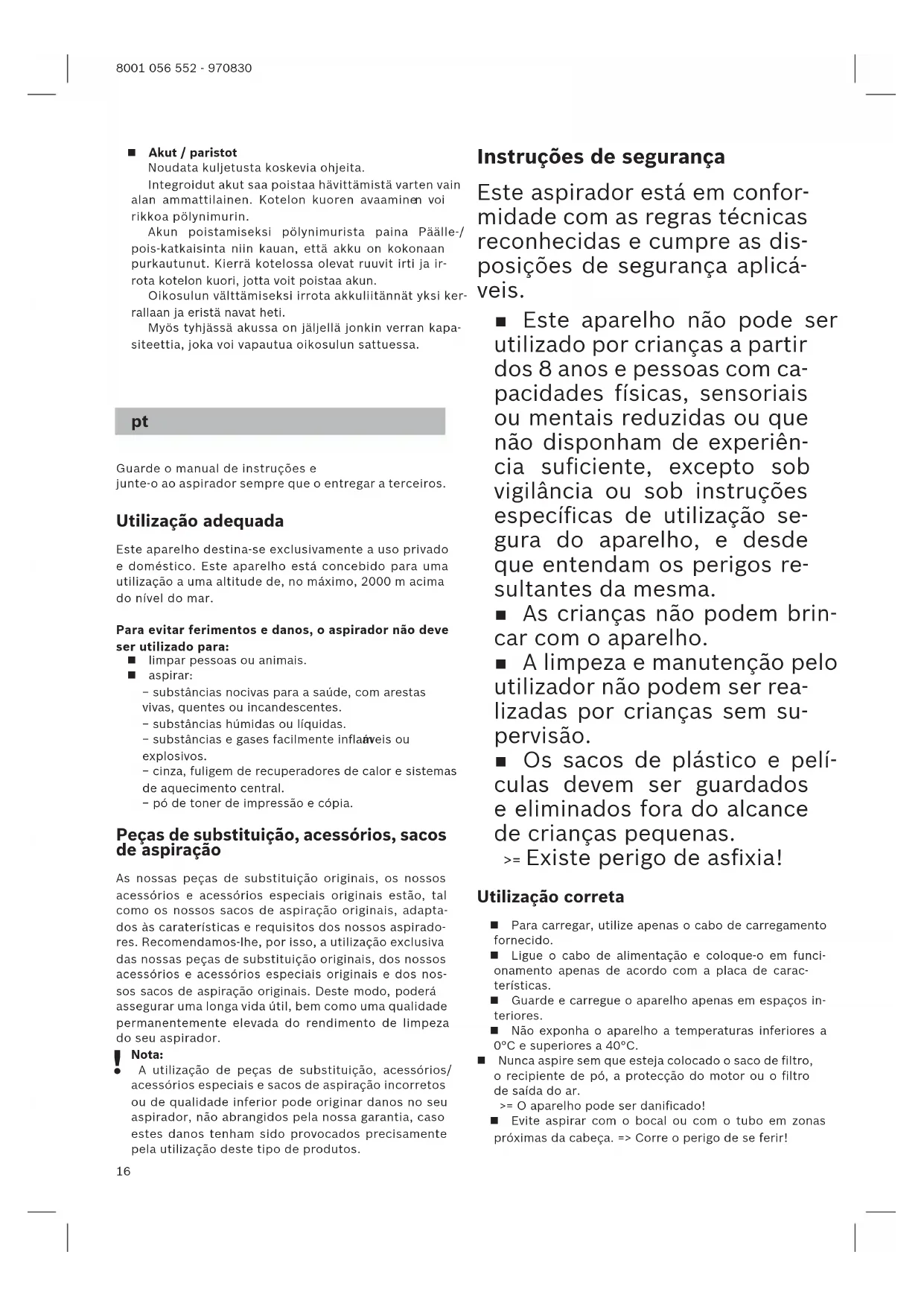 eniza, hollín de estufas cerámicas e instalaciones de calefacción central; − polvo de tóner de impresoras y fotocopiadoras. Embalagem A embalagem protege o aspirador contra danos du- rante o transporte. É composta por materiais amigos do ambiente, sendo, por isso, reciclável. Coloque os materiais de embalagem de que já não precisa nos ecopontos. Aparelho antigo Este aparelho contém baterias de iões de lítio re- carregáveis. Por esse motivo, o aparelho deve ser entregue à assistência técnica ou a um revendedor autorizado para ser eliminado. Baterias / Pilhas Respeite as indicações sobre o transporte. As baterias integradas só podem ser retiradas para eliminação por pessoal técnico qualificado. A aber- tura do alojamento da caixa pode destruir o aspira- dor. Para retirar a bateria do aspirador, acione o botão para ligar/desligar até a bateria estar completamen- te descarregada. Desaperte os parafusos na caixa e remova a o alojamento da caixa, para retirar a bate- ria. Para evitar um curto-circuito, separe individualmen- te as ligações na bateria e, em seguida, isole imedia- tamente os polos. Mesmo após um d escarregamento completo, a bate- ria ainda contém capacidade residual que pode ser libertada, em caso de curto-circuito.18 8001 056 552 - 970830 Recambios, accesorios, bolsas para pol-