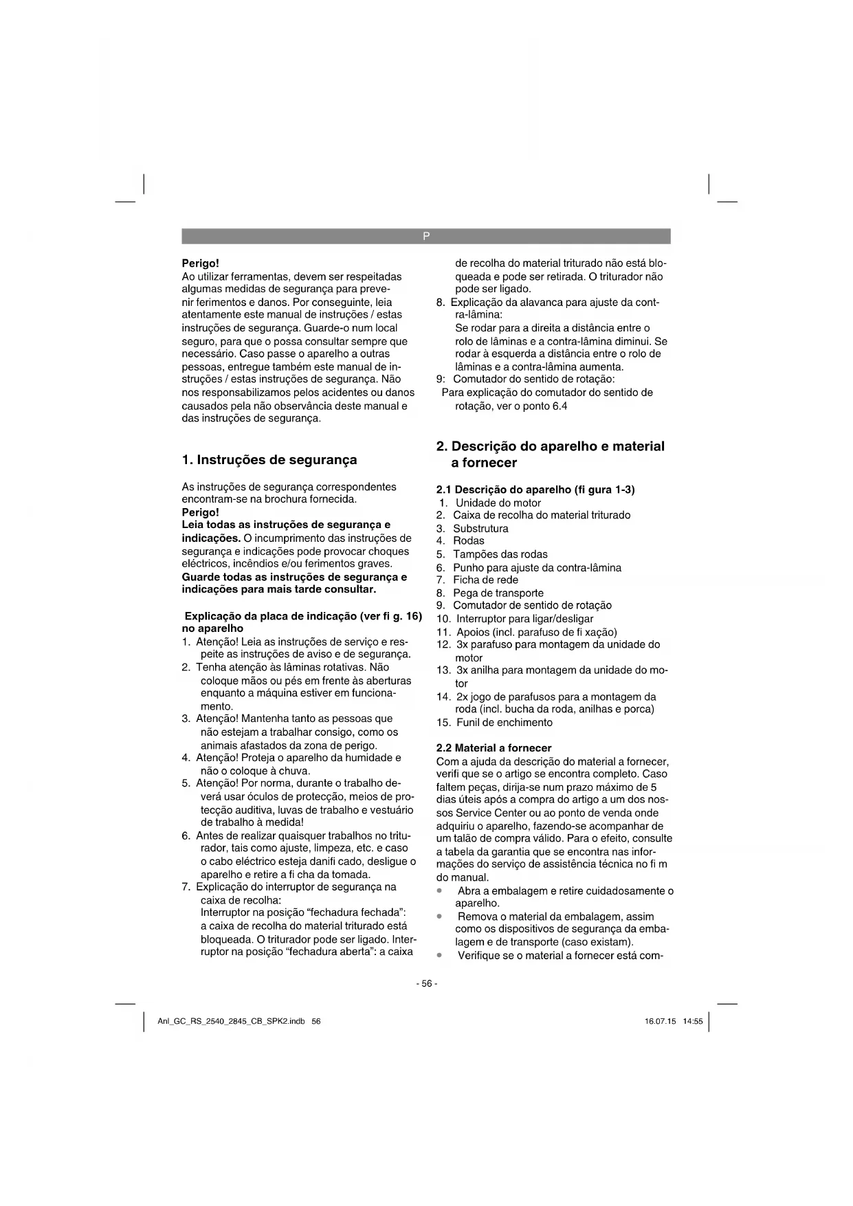 A lamina trituradora (fig. 16/pos. G) e a contra-lamina (fig. 16/pos. F) pode ser ahora removidas e verificadas. As peças desgastadas ou danificadas tem de ser substituções. Utilize apenas as peças sobressalentes previstas para o efeito do fabricante (ver „Encomenda de peças sobressalentes").