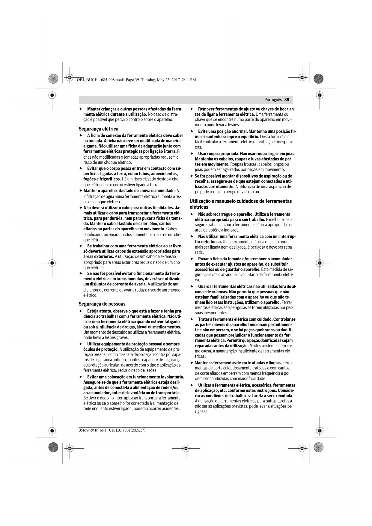OBJ_BUCH-1685-008.book Page 42 Tuesday, May 23, 2017 2:11 PMPortuguês | 43 Bosch Power Tools F 016 L81 736 | (23.5.17) Informação sobre ruídos/vibrações Os valores de emissão de ruído determinados de acordo com EN 60745-2-15. O nível de ruído avaliado como A do aparelho é tipicamente: Nível de pressão acústica 67 dB(A); Nível de potência acústi- ca 87 dB(A). Incerteza K =3 dB. Usar proteção auricular! Totais valores de vibrações a