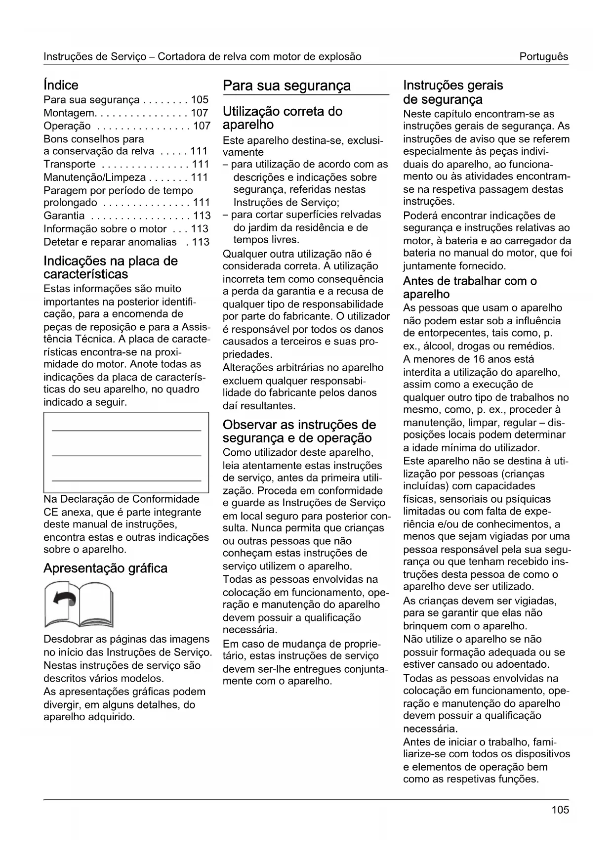 - Informação sobre o motor Detetar e reparar anomalias . 113 Indicações na placa de características Estas informações são muito importantes na posterior identifi- cação, para a encomenda de peças de reposição e para a Assis- tência Técnica. A placa de caracte- rísticas encontra-se na proxi- midade do motor. Anote todas as indicações da placa de caracterís- ticas do seu aparelho, no quadro indicado a seguir. Na Declaração de Conformidade CE anexa, que é parte integrante deste manual de instruções, encontra estas e outras indicações sobre o aparelho. Apresentação gráfica Desdobrar as páginas das imagens no início das Instruções de Serviço. Nestas instruções de serviço são descritos vários modelos. As apresentações gráficas podem divergir, em alguns detalhes, do aparelho adquirido. Para sua segurança Utilização correta do aparelho Este aparelho destina-se, exclusi- vamente – para utilização de acordo com as descrições e indicações sobre segurança, referidas nestas Instruções de Serviço; – para cortar superfícies relvadas do jardim da residência e de tempos livres. Qualquer outra utilização não é considerada correta. A utilização incorreta tem como consequência a perda da garantia e a recusa de qualquer tipo de responsabilidade por parte do fabricante. O utilizador é responsável por todos os danos causados a terceiros e suas pro- priedades. Alterações arbitrárias no aparelho excluem qualquer responsabi- lidade do fabricante pelos danos daí resultantes. Observar as instruções de segurança e de operação Como utilizador deste aparelho, leia atentamente estas instruções de serviço, antes da primeira utili- zação. Proceda em conformidade e guarde as Instruções de Serviço em local seguro para posterior con- sulta. Nunca permita que crianças ou outras pessoas que não conheçam estas instruções de serviço utilizem o aparelho. Todas as pessoas envolvidas na colocação em funcionamento, ope- ração e manutenção do aparelho devem possuir a qualificação necessária. Em caso de mudança de proprie- tário, estas instruções de serviço devem ser-lhe entregues conjunta- mente com o aparelho. Instruções gerais de segurança Neste capítulo encontram-se as instruções gerais de segurança. As instruções de aviso que se referem especialmente às peças indivi- duais do aparelho, ao funciona- mento ou às atividades encontram- se na respetiva passagem destas instruções. Poderá encontrar indicações de segurança e instruções relativas ao motor, à bateria e ao carregador da bateria no manual do motor, que foi juntamente fornecido. Antes de trabalhar com o aparelho As pessoas que usam o aparelho não podem estar sob a influência de entorpecentes, tais como, p. ex., álcool, drogas ou remédios. A menores de 16 anos está interdita a utilização do aparelho, assim como a execução de qualquer outro tipo de trabalhos no mesmo, como, p. ex., proceder à manutenção, limpar, regular – dis- posições locais podem determinar a idade mínima do utilizador. Este aparelho não se destina à uti- lização por pessoas (crianças incluídas) com capacidades físicas, sensoriais ou psíquicas limitadas ou com falta de expe- riência e/ou de conhecimentos, a menos que sejam vigiadas por uma pessoa responsável pela sua segu- rança ou que tenham recebido ins- truções desta pessoa de como o aparelho deve ser utilizado. As crianças devem ser vigiadas, para se garantir que elas não brinquem com o aparelho. Não utilize o aparelho se não possuir formação adequada ou se estiver cansado ou adoentado. Todas as pessoas envolvidas na colocação em funcionamento, ope- ração e manutenção do aparelho devem possuir a qualificação necessária. Antes de iniciar o trabalho, fami- liarize-se com todos os dispositivos e elementos de operação bem como as respetivas funções.Português Instruções de Serviço – Cortadora de relva com motor de explosão p. 113