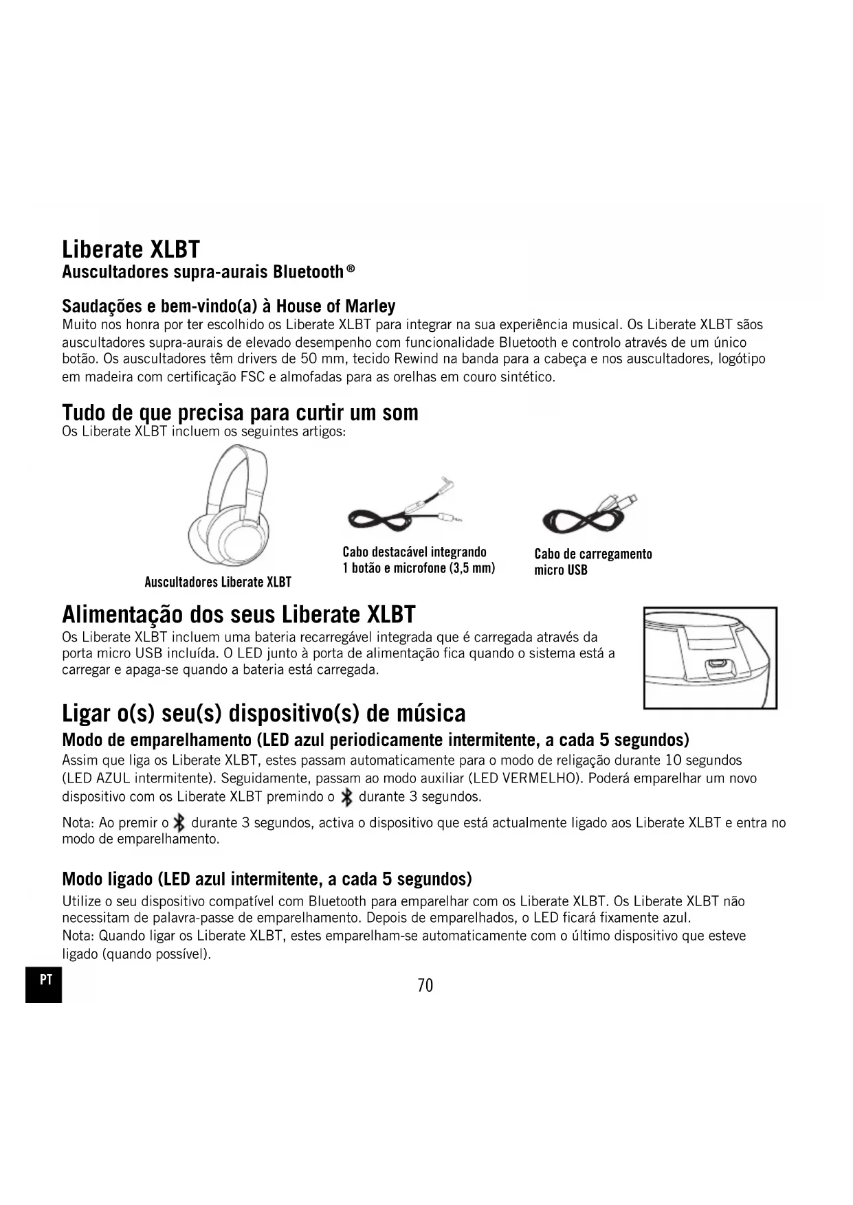 Saudações e bem-vindo(a) à House of Marley Muito nos honra por ter escolhido os Liberate XLBT para integrar na sua experiência musical. Os Liberate XLBT sãos auscultadores supra-aurais de elevado desempenho com funcionalidade Bluetooth e controlo através de um único botão. Os auscultadores têm drivers de 50 mm, tecido Rewind na banda para a cabeça e nos auscultadores, logótipo em madeira com certificação FSC e almofadas para as orelhas em couro sintético. Tudo de que precisa para curtir um som Os Liberate XLBT incluem os seguintes artigos: Auscultadores Liberate XLBT Cabo destacável integrando 1 botão e microfone (3,5 mm) Cabo de carregamento micro USB Alimentação dos seus Liberate XLBT Os Liberate XLBT incluem uma bateria recarregável integrada que é carregada através da porta micro USB incluída. O LED junto à porta de alimentação fica quando o sistema está a carregar e apaga-se quando a bateria está carregada. Ligar o(s) seu(s) dispositivo(s) de música Modo de emparelhamento (LED azul periodicamente intermitente, a cada 5 segundos) Assim que liga os Liberate XLBT, estes passam automaticamente para o modo de religação durante 10 segundos (LED AZUL intermitente). Seguidamente, passam ao modo auxiliar (LED VERMELHO). Poderá emparelhar um novo dispositivo com os Liberate XLBT premindo o durante 3 segundos. Nota: Ao premir o durante 3 segundos, activa o dispositivo que está actualmente ligado aos Liberate XLBT e entra no modo de emparelhamento. Modo ligado (LED azul intermitente, a cada 5 segundos) Utilize o seu dispositivo compatível com Bluetooth para emparelhar com os Liberate XLBT. Os Liberate XLBT não necessitam de palavra-passe de emparelhamento. Depois de emparelhados, o LED ficará fixamente azul. Nota: Quando ligar os Liberate XLBT, estes emparelham-se automaticamente com o último dispositivo que esteve ligado (quando possível). PT71 Carregar o seu dispositivo Está disponível uma conveniente porta micro USB no auscultador direito dos Liberate XLBT para carregar os seus dispositivos enquanto os auscultadores estão ligados ou desligados. Utilize o cabo incluído com o seu dispositivo para o carregar. NOTA: Nem todos os dispositivos são compatíveis com a porta micro USB. Substituição da bateria O seu Liberate XLBT inclui uma bateria vitalícia recarregável. Na hipótese pouco provável de necessitar de substituir a bateria, contacte o Serviço de Apoio ao Cliente, que lhe irá disponibilizar informações sobre o serviço de substituição da bateria ao abrigo da garantia e fora da cobertura da garantia. Toque para controlar o volume Mantenha premido para ajustar o volume Toque para ligação BT (ao último dispositivo) Mantenha premido para emparelhar (ou desligar e emparelhar) Toque para pausar a faixa actual Toque para reproduzir a faixa actualmente pausada Toque para atender uma chamada recebida Toque para terminar a chamada actual Mantenha premido para ligar Prima para verificar o nível da bateria Mantenha premido para desligar Toque para mudar de faixa Mantenha premido para avançar/retroceder rapidamente72 Compatibilidade com Microfone e Controlo de Um Botão O microfone integrado permite conversas do tipo mãos-livres. Prima o botão para atender uma chamada; prima novamente para terminar a chamada.As funções de rastreamento e reprodução/pausa, conforme ilustrado na figura, apenas funcionam com equipamentos da Apple. x1 x1