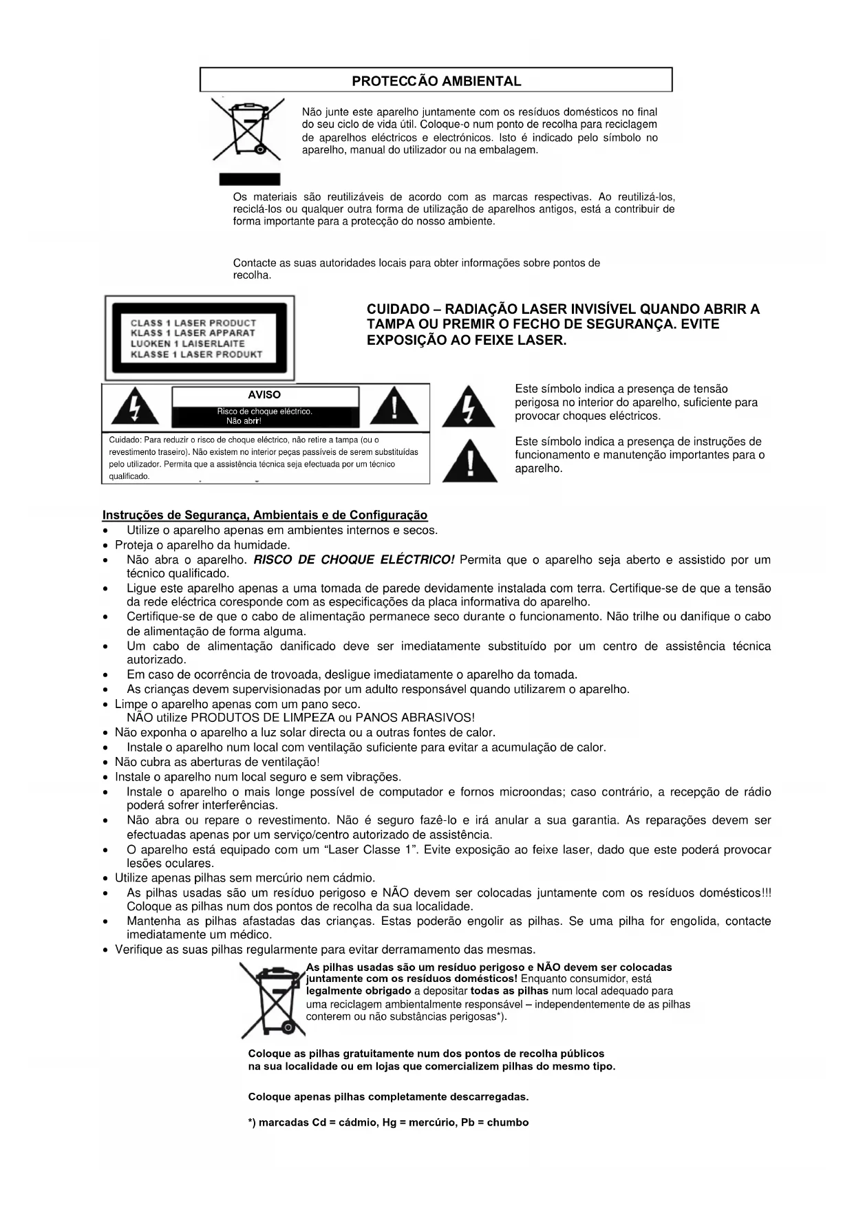 - O aparecido está equipado com um "Laser Classe 1". Evite exposicao ao feixe laser, quando oteme podere provocar lesoes oculares.