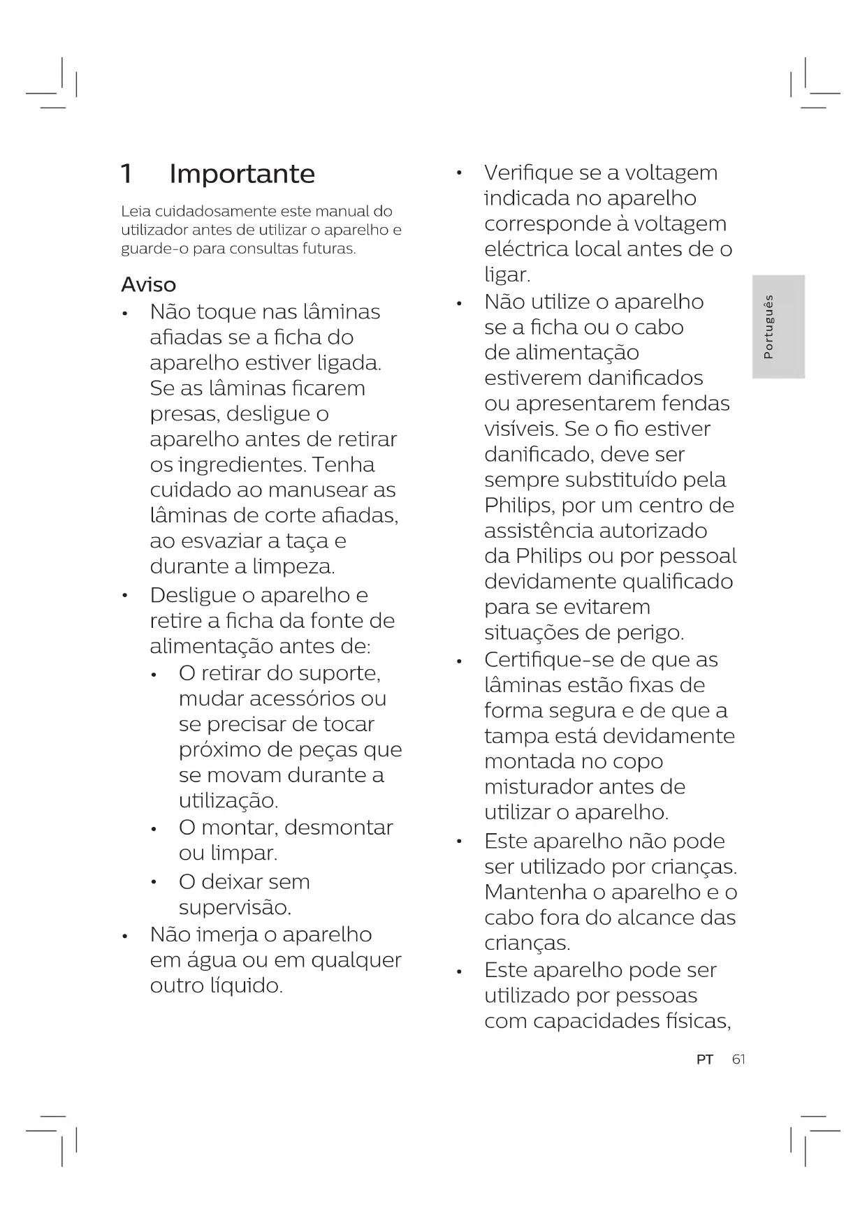Este aparelho pode ser utilizado por pessoas com capacidades físicas, 1 Importante Leia cuidadosamente este manual do utilizador antes de utilizar o aparelho e guarde-o para consultas futuras. Aviso