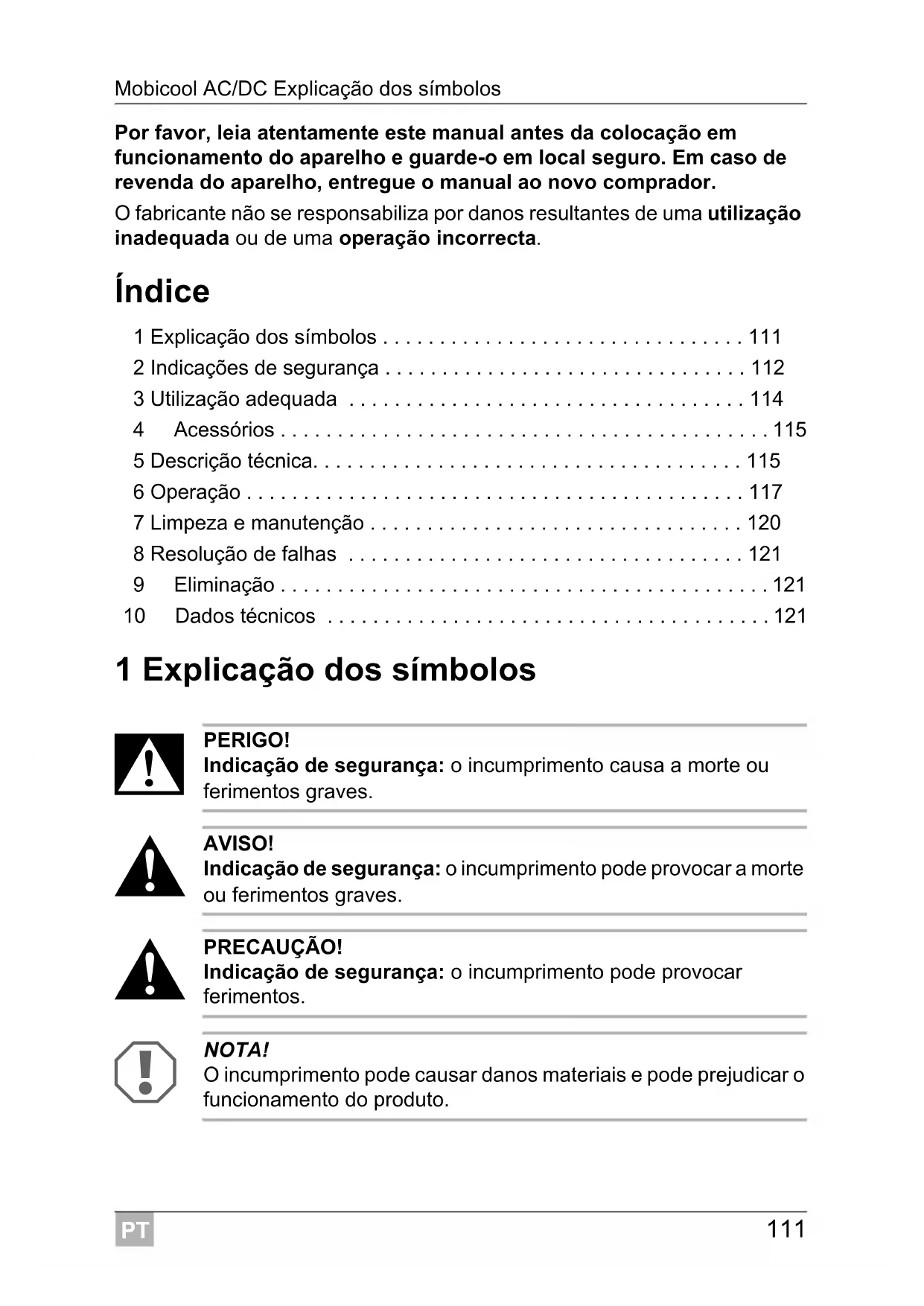 NOTA! O incumprimento pode causar danos materiais e pode prejudicar o funcionamento do produto.PT Indicações de segurança Mobicool AC/DC