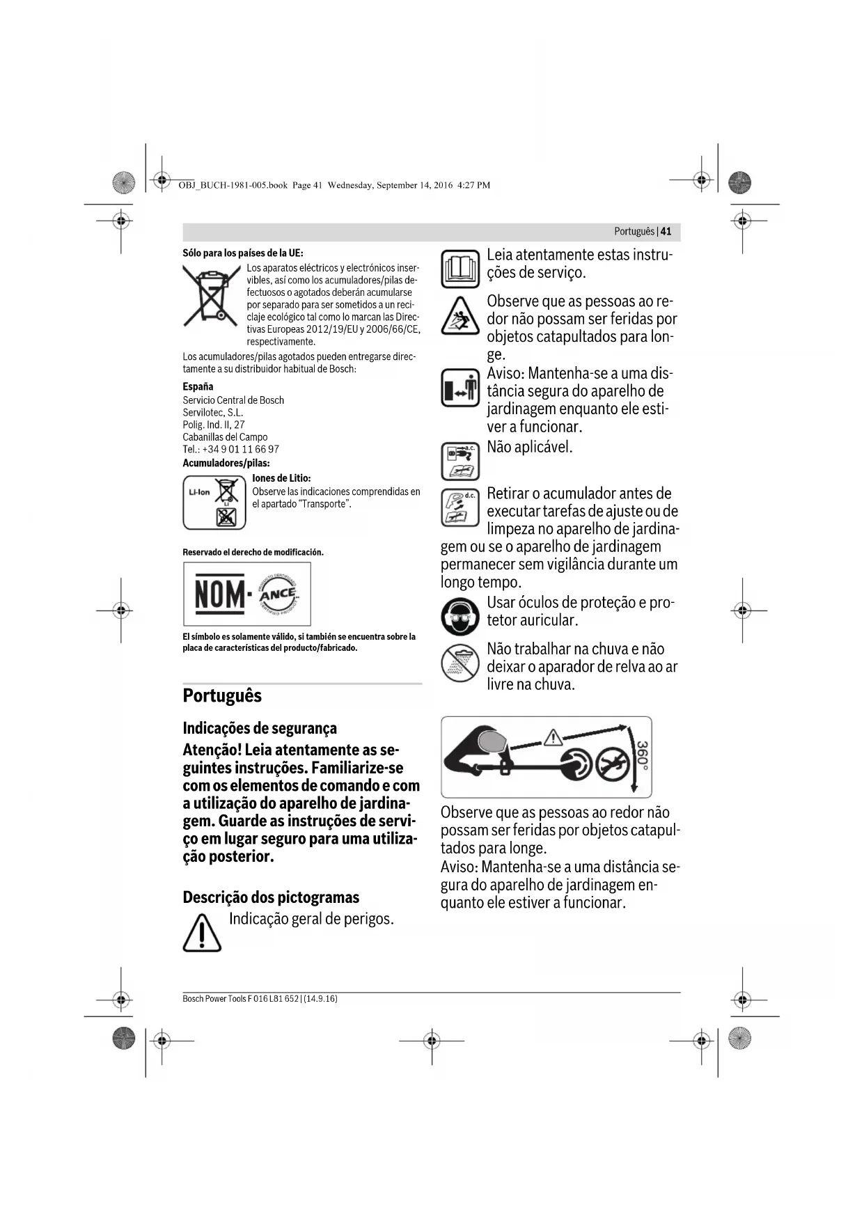 Acumulador sin colocar, o mal colocado Colocar correctamente el acumulador en el cargador Contactos sucios del acumulador Limpiar los contactos del acumulador; p. ej. metiéndolo y sacándolo repetida- mente, o bien, sustituir el acumulador Acumulador defectuoso Sustituir el acumulador El indicador de carga del acumulador no se enciende El enchufe de red del cargador no está correctamente conectado Introducir completamente el enchufe en la toma de corriente Toma de corriente, cable de red o carga- dor defectuoso Verifique la tensión de red, y si fuese preciso, acuda a un servicio técnico au- torizado para herramientas eléctricas Bosch para hacer revisar el cargador Síntomas Posible causa Solución OBJ_BUCH-1981-005.book Page 40 Wednesday, September 14, 2016 4:27 PMPortuguês | 41 Bosch Power Tools F 016 L81 652 | (14.9.16) Sólo para los países de la UE: Los aparatos eléctricos y electrónicos inser- vibles, así como los acumuladores/pilas de- fectuosos o agotados deberán acumularse por separado para ser sometidos a un reci- claje ecológico tal como lo marcan las Direc- tivas Europeas 2012/19/EU y 2006/66/CE, respectivamente. Los acumuladores/pilas agotados pueden entregarse direc- tamente a su distribuidor habitual de Bosch: España Servicio Central de Bosch Servilotec, S.L. Polig. Ind. II, 27 Cabanillas del Campo Tel.: +34 9 01 11 66 97 Acumuladores/pilas: Iones de Litio: Observe las indicaciones comprendidas en el apartado “Transporte”. Reservado el derecho de modificación. El símbolo es solamente válido, si también se encuentra sobre la placa de características del producto/fabricado. Português Indicações de segurança Atenção! Leia atentamente as se- guintes instruções. Familiarize-se com os elementos de comando e com a utilização do aparelho de jardina- gem. Guarde as instruções de servi- ço em lugar seguro para uma utiliza- ção posterior. Descrição dos pictogramas Indicação geral de perigos. Leia atentamente estas instru- ções de serviço. Observe que as pessoas ao re- dor não possam ser feridas por objetos catapultados para lon- ge. Aviso: Mantenha-se a uma dis- tância segura do aparelho de jardinagem enquanto ele esti- ver a funcionar. Não aplicável. Retirar o acumulador antes de executar tarefas de ajuste ou de limpeza no aparelho de jardina- gem ou se o aparelho de jardinagem permanecer sem vigilância durante um longo tempo. Usar óculos de proteção e pro- tetor auricular. Não trabalhar na chuva e não deixar o aparador de relva ao ar livre na chuva. Observe que as pessoas ao redor não possam ser feridas por objetos catapul- tados para longe. Aviso: Mantenha-se a uma distância se- gura do aparelho de jardinagem en- quanto ele estiver a funcionar. a.c. d.c. OBJ_BUCH-1981-005.book Page 41 Wednesday, September 14, 2016 4:27 PM42 | Português F 016 L81 652 | (14.9.16) Bosch Power Tools Operação Este aparelho de jardim não deve ser usado por pessoas (inclusive crian- ças) com limitadas capacidades físi- cas, sensoriais ou mentais ou com fal- ta de experiência e/ou falta de conhecimento, a não ser que, sejam supervisionadas por uma pessoa res- ponsável pela sua segurança ou que sejam instruídas por elas quanto à utilização do aparelho de jardim. Crianças deveriam ser vigiadas para assegurar que não brinquem com o aparelho. Jamais permitir que crianças ou pes- soas não familiarizadas com as instru- ções utilizem o aparador de sebes. É possível que diretivas nacionais limi- tem a idade do operador. Quando não estiver em uso, o aparador deve- rá ser guardado em local inacessível para crianças. Nunca use o aparador se faltarem co- berturas ou dispositivos de proteção ou se estes estiverem danificados ou se não estiverem corretamente posi- cionados. Após um golpe, deverá controlar se o aparelho apresenta desgastes ou da- nos e se necessário deixar que seja reparado antes da próxima utiliza- ção. Não utilizar o aparelho de jardinagem se estiver fatigado ou doente, sob a influência de drogas, álcool ou medi- camentos. Devem ser usadas calças longas e pe- sadas, sapatos e luvas firmes. Não usar roupas largas, jóias, calças cur- tas, sandalhas nem trabalhe de pés descalços. Amarre o cabelo longo aci- ma da altura do ombro, para evitar que se enganchem em peças móveis. Devem ser usados óculos de prote- ção auricular para operar o apare- lho de jardim. Manter sempre uma posição firme e o equilíbrio. Não se esforce demais. Jamais trabalhar com aparador en- quanto pessoas, especialmente crianças, ou animais e estiverem ao redor. O operador ou o utilizador é respon- sável por acidentes ou danos, se ou- tras pessoas forem feridas e se as su- as propriedades forem danificadas. Aguardar, até a lâmina em rotação para completamente, antes de to- cá-la. Após desligar o motor, a lâmina continua a girar e pode causar lesões. Só trabalhe à luz do dia ou com boa iluminação artificial. Em condições climáticas desfavorá- veis, especialmente em caso de uma tempestade, não deverá trabalhar com o aparador de relvas. A utilização do aparador em relva mo- lhada reduz a potência de trabalho. Desligar o aparador ao transportá-lo da/para a superfície de trabalho. Só ligar o aparelho de jardim se as mãos e os pés estiverem suficiente- mente afastados das lâminas de cor- te. As mãos e os pés não devem se apro- ximar dos elementos de corte em ro- tação. Remover o acumulador antes de substituir a lâmina. OBJ_BUCH-1981-005.book Page 42 Wednesday, September 14, 2016 4:27 PMPortuguês | 43 Bosch Power Tools F 016 L81 652 | (14.9.16) Jamais utilize elementos de corte me- tálicos para este aparador. O aparador requer um controlo e uma manutenção em intervalos regulares. O aparador só deve ser reparado por oficinas de serviço autorizadas. Assegure-se sempre de que as aber- turas de ventilação estejam livres de restos de relva. Remover o acumulador: – sempre que deixar o aparelho de 