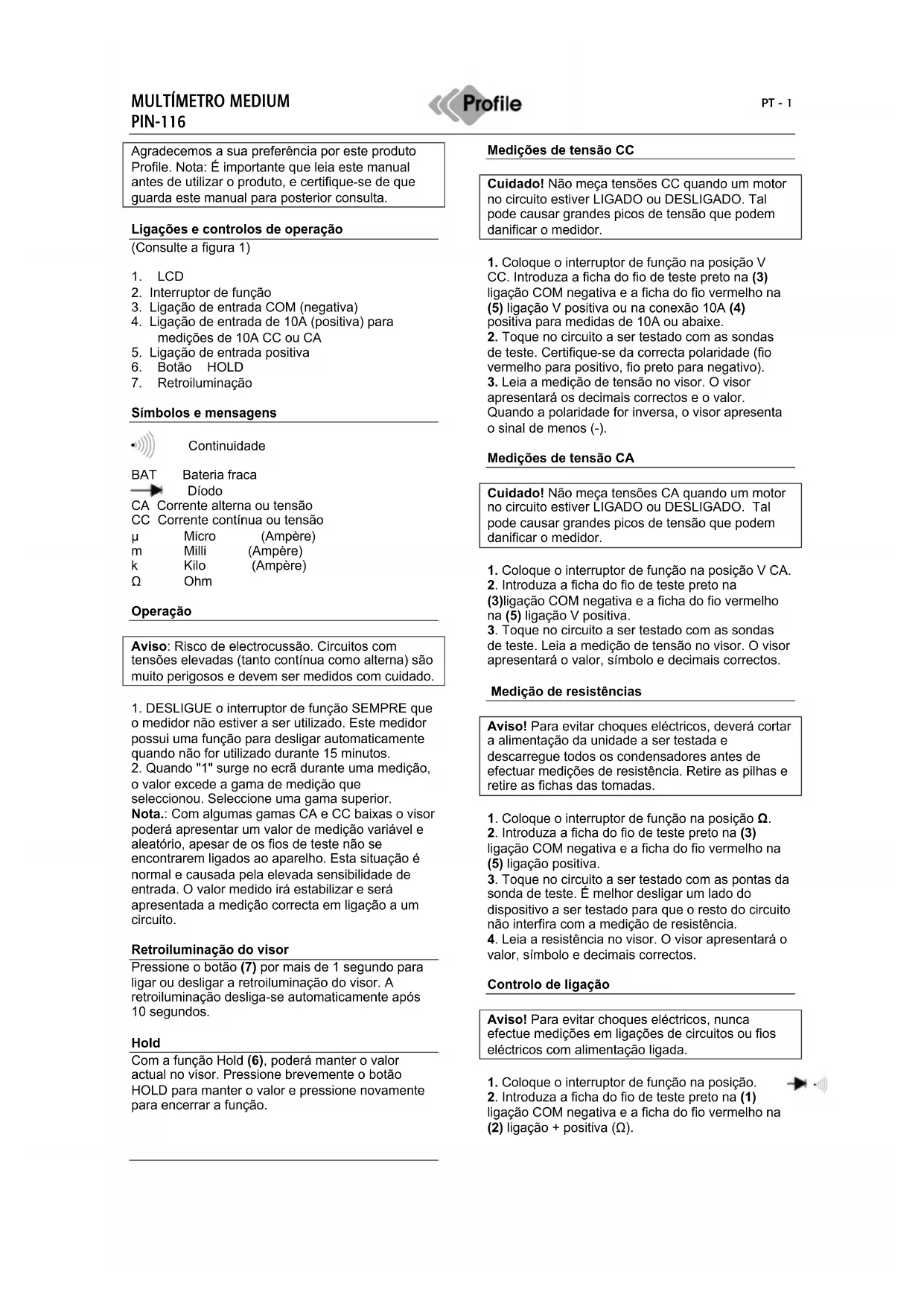 PIN116 - Multímetro Profile - Manual de utilização gratuito