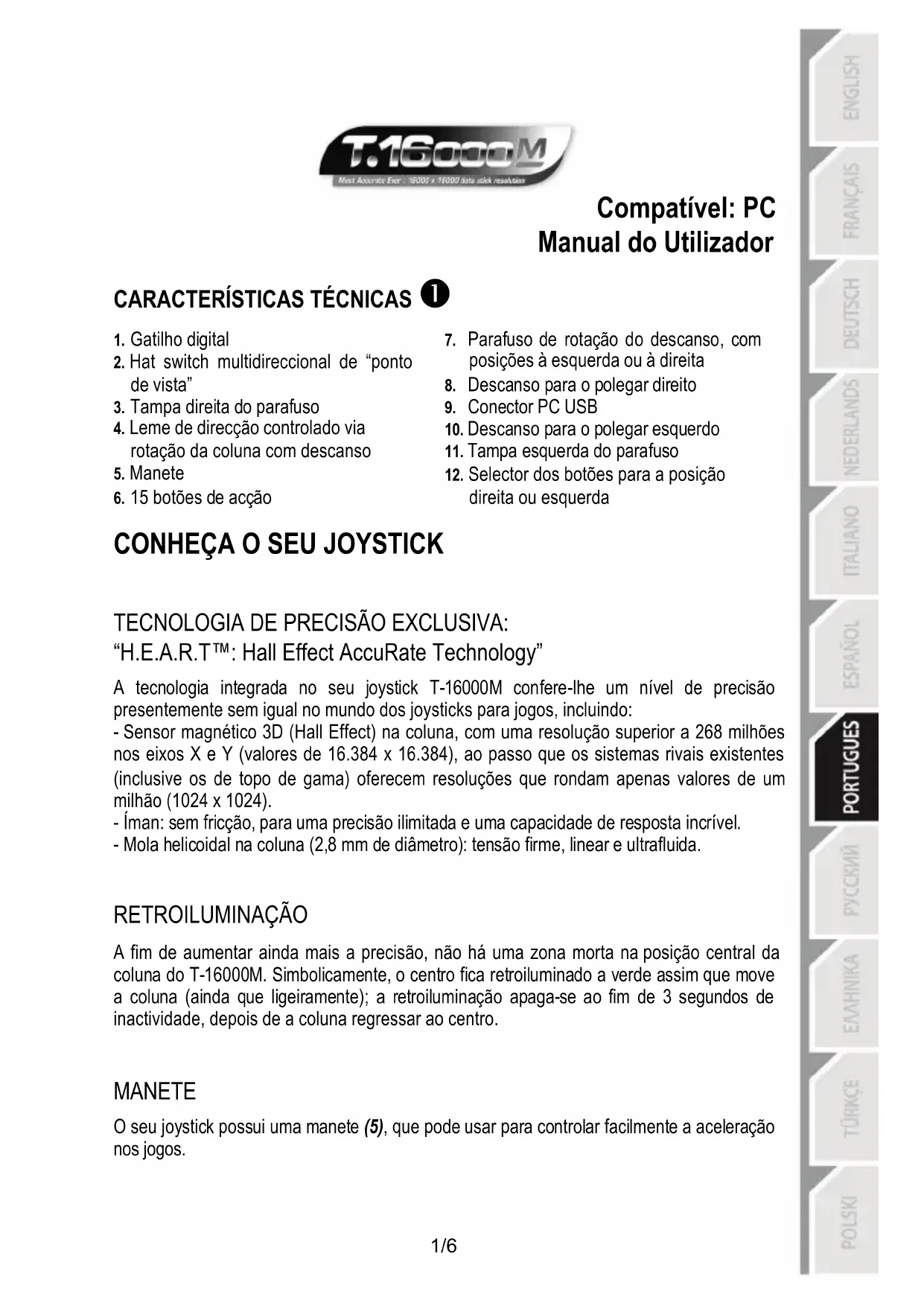 TECNOLOGIA DE PRECISÃO EXCLUSIVA: “H.E.A.R.T™: Hall Effect AccuRate Technology” A tecnologia integrada no seu joystick T-16000M confere-lhe um nível de precisão presentemente sem igual no mundo dos joysticks para jogos, incluindo: - Sensor magnético 3D (Hall Effect) na coluna, com uma resolução superior a 268 milhões nos eixos X e Y (valores de 16.384 x 16.384), ao passo que os sistemas rivais existentes (inclusive os de topo de gama) oferecem resoluções que rondam apenas valores de um milhão (1024 x 1024). - Íman: sem fricção, para uma precisão ilimitada e uma capacidade de resposta incrível. - Mola helicoidal na coluna (2,8 mm de diâmetro): tensão firme, linear e ultrafluida.