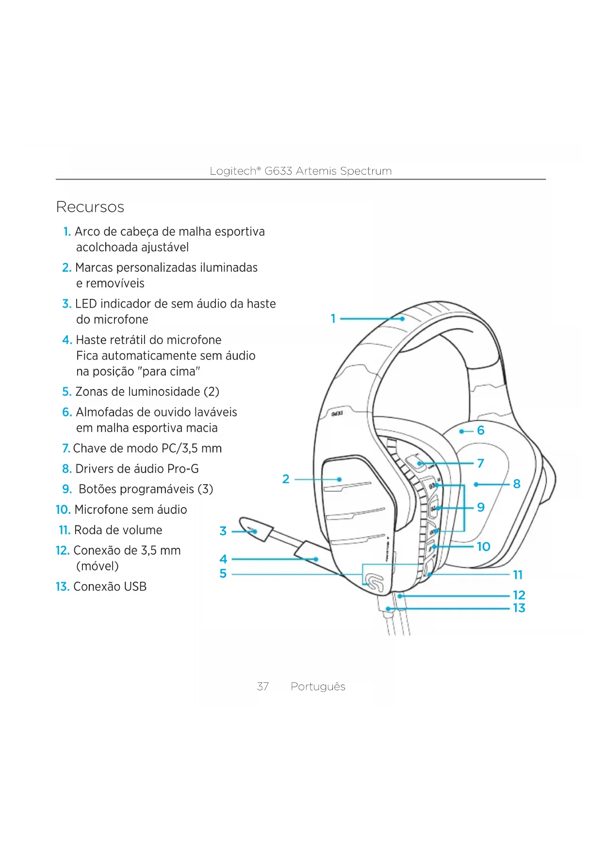 1Logitech® G633 Artemis Spectrum 40 Português Instalação para PC (modo PC)