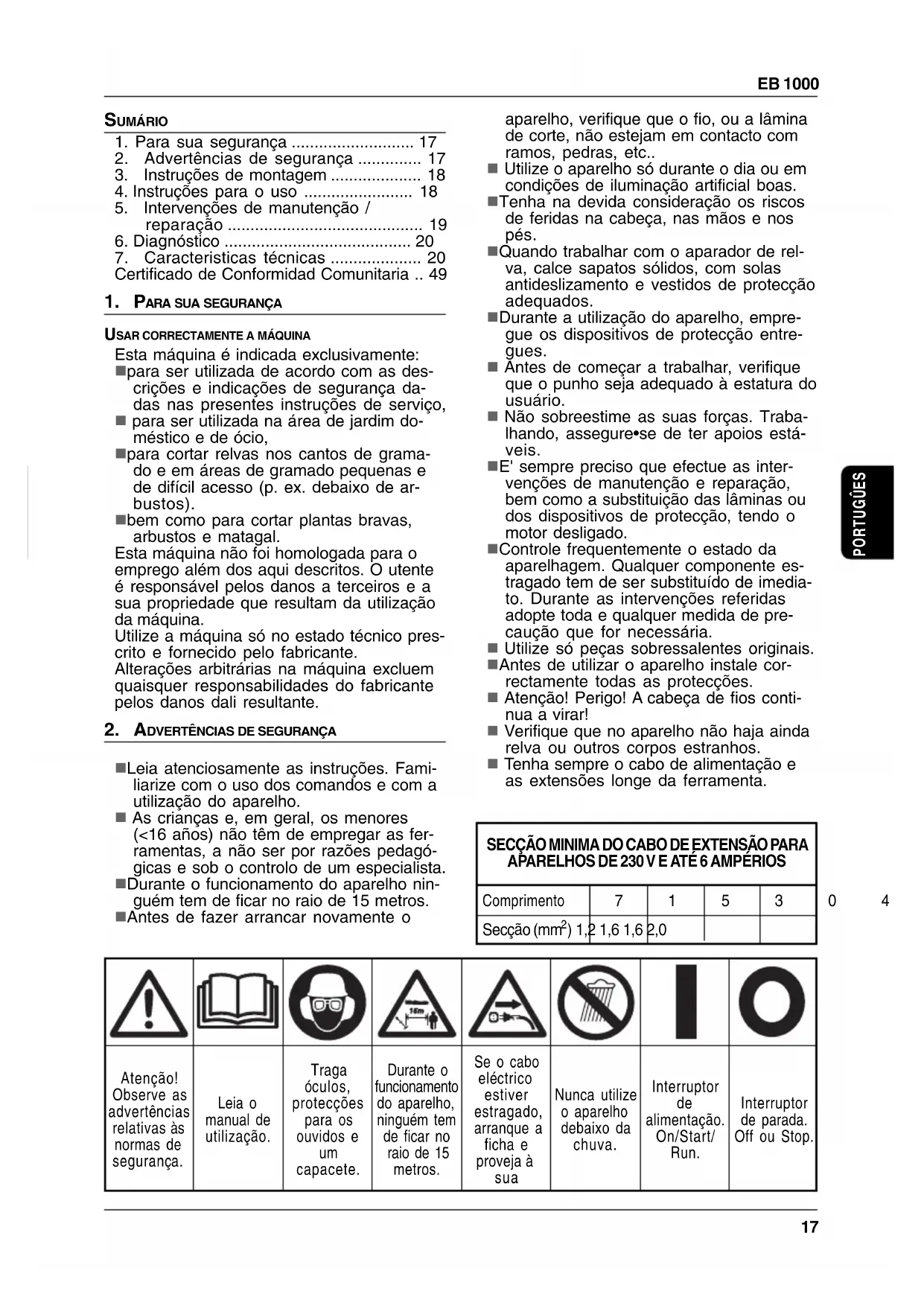 alimentação. On/Start/ Run. Interruptor de parada. Off ou Stop. eb1000_por.p65 10/03/03, 8:111718 EB 1000 n Desligue o motor e a tomada de corrente principal antes de limpar ou regular o apa- relho ou antes de verificar os cabos re- torcidos ou estragados. n Verifique regularmente os cabos a fim de descobrir estragos ou desgaste eventu- ais. n Utilize a ferramenta só se os cabos esti- verem em condições óptimas. n A manutenção e a limpeza do aparelho e a regulação da cabeça de fios têm de ser executadas só tendo o motor desligado e a ficha desonectada. n Cabos eléctricos • Assegure•se de que o cabo de extensão esteja em boas condi- ções e que seja adequado à potência ab- sorvida pelo aparelho. Um cabo subdimensionado pode causar a queda de tensão e superaquecimento. A tábua ilustra a correcta secção do cabo a em- pregar relativamente ao comprimento e à corrente (veja a etiqueta no aparelho). Se tiver dúvidas, use um cabo de secção maior. n Por razões de segurança o utensílio de- verá ser ligado numa tomada eléctrica protegida por um interruptor diferencial com uma corrente máxima de 30 mA. n Em caso de corte acidental do cabo eléc- trico de alimentação, durante o uso do utensílio, retirar imediatamente a ficha da tomada de corrente eléctrica.