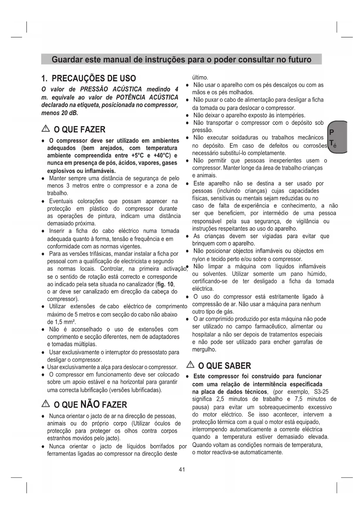 - O compressor deve ser utiliser em ambientes adequados (bem arejados, com temperatura ambiente comprehendida entre +5^ e +40^ ) e nunca em presence de pos, acidos, vapores, gases explosivos ou inflamáveis.