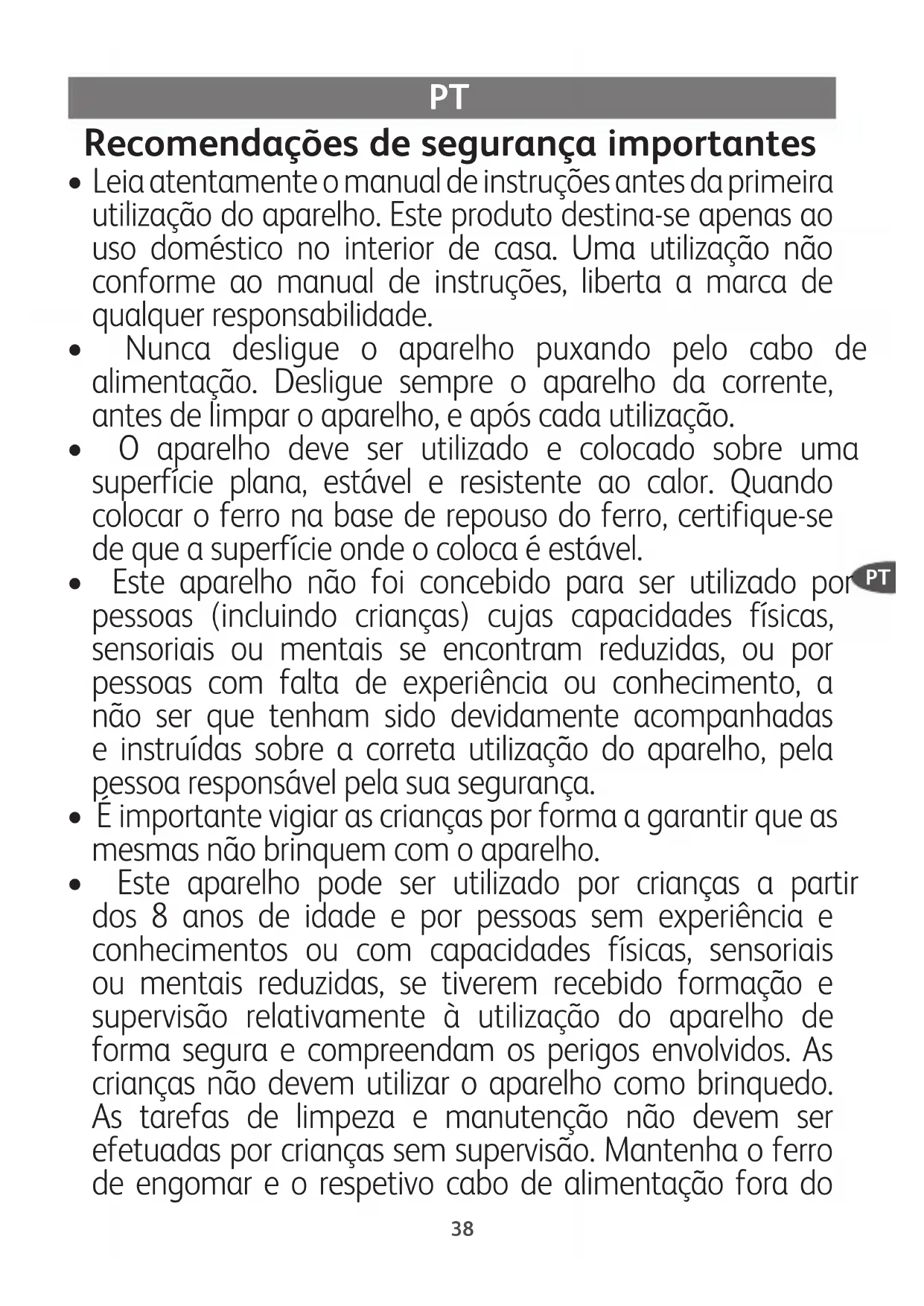 - Este aparelho pode ser utilizado por crianças a partir dos 8 anos de idade e por pessoas sem experiência e conhecimentos ou com capacidades físicas, sensoriais ou mentais reduzidas, se tiverem recebido formação e supervisão relativamente à utilização do aparelho de forma segura e compreendam os perigos envolvidos. As crianças não devem utilizar o aparelho como brinquedo. As tarefas de limpeza e manutenção não devem ser efetuadas por crianças sem supervisão. Mantenha o ferro de engomar e o respetivo cabo de alimentação fora do PT39 alcance das crianças com idade inferior a 8 anos, sempre que o aparelho se encontrar ligado ou a arrefecer.