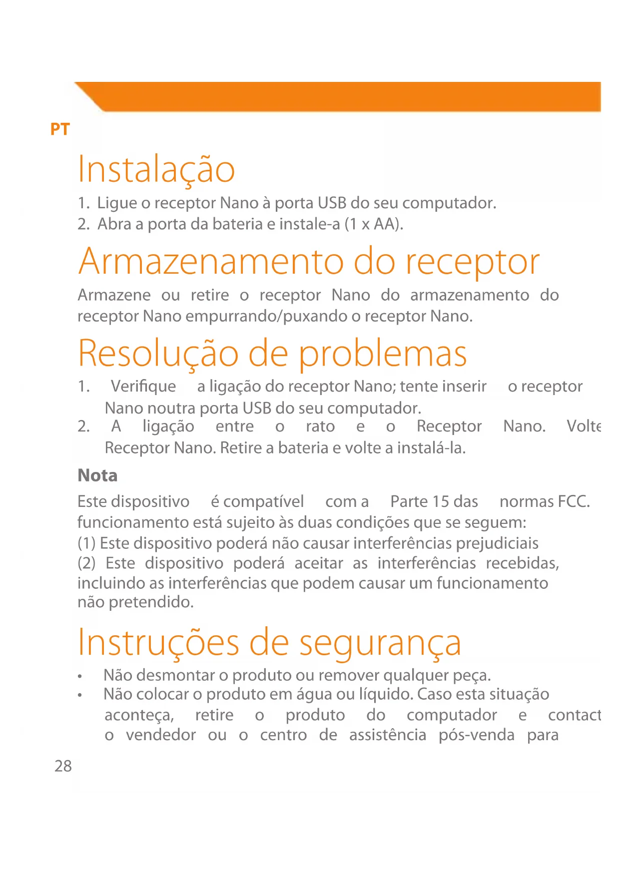 - A ligação entre o rato e o Receptor Nano. Volte Receptor Nano. Retire a bateria e volte a instalá-la.