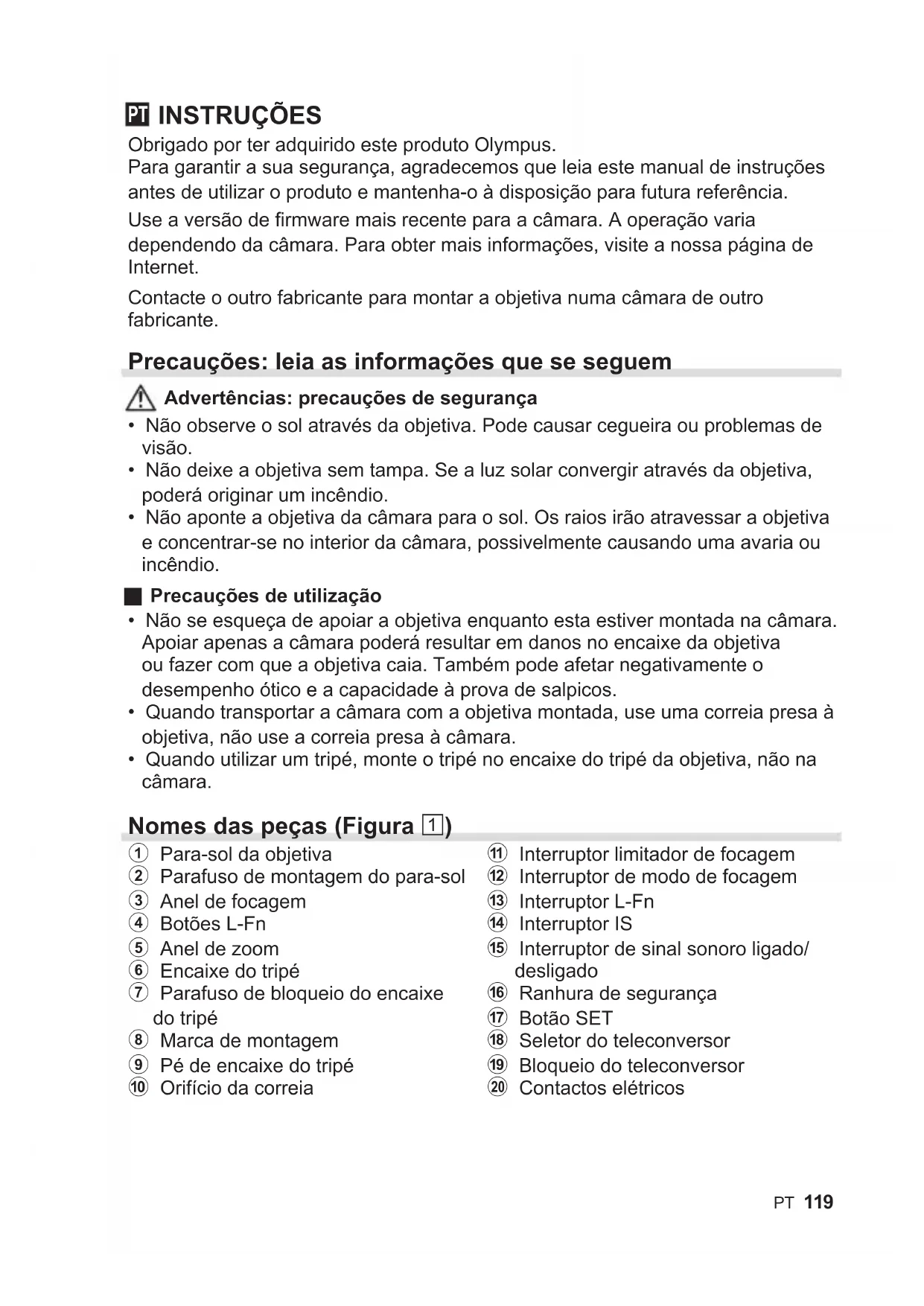 INSTRUÇÕES Obrigado por ter adquirido este produto Olympus. Para garantir a sua segurança, agradecemos que leia este manual de instruções antes de utilizar o produto e mantenha-o à disposição para futura referência. Use a versão de firmware mais recente para a câmara. A operação varia dependendo da câmara. Para obter mais informações, visite a nossa página de Internet. Contacte o outro fabricante para montar a objetiva numa câmara de outro fabricante. Precauções: leia as informações que se seguem Advertências: precauções de segurança