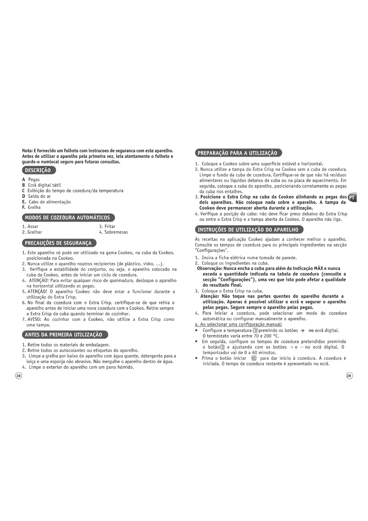 Nota: E fornecido um folheto com instrucoes de seguranca com este aparelho. Antes de utilizar o aparelho pela primeira vez, leia atentamente o folheto e guarde-o numlocal seguro para futuras consultas. DESCRIÇÃO A Pegas B Ecrã digital tátil C Exibição do tempo de cozedura/da temperatura D Saída do ar E. Cabo de alimentação F. Grelha