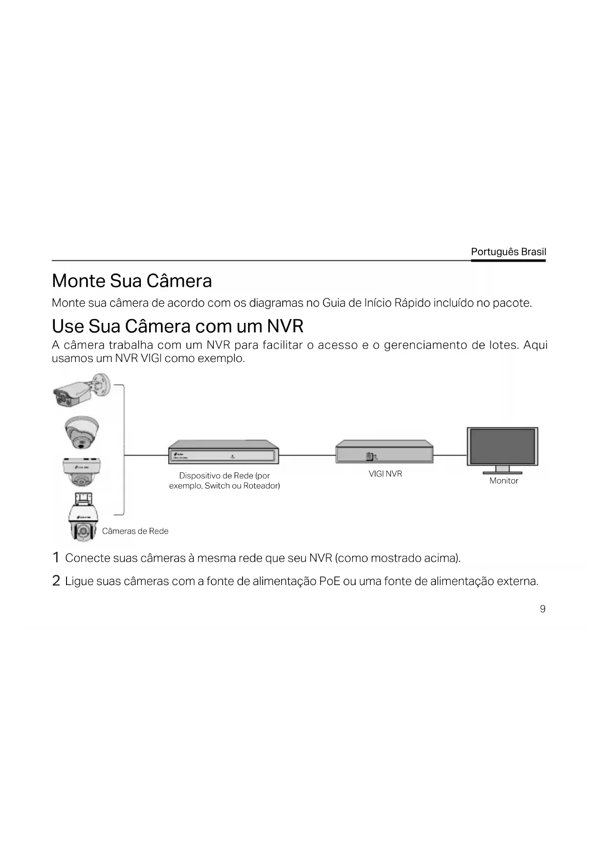 Ligue suas câmeras com a fonte de alimentação PoE ou uma fonte de alimentação externa.10 Português BrasilNota: A fonte de alimentação padrão da câmera é 12V DC ou PoE (802.3af/at). A fonte de alimentação deve estar em conformidade com a Classe de Fonte de Alimentação 2 (PS2) ou Fonte de Alimentação Limitada (LPS) da IEC 62368-1. Alguns modelos não suportam fonte de alimentação DC. Você pode vericar as especicações detalhadas na página do produto em https://www.tp-link.com/.