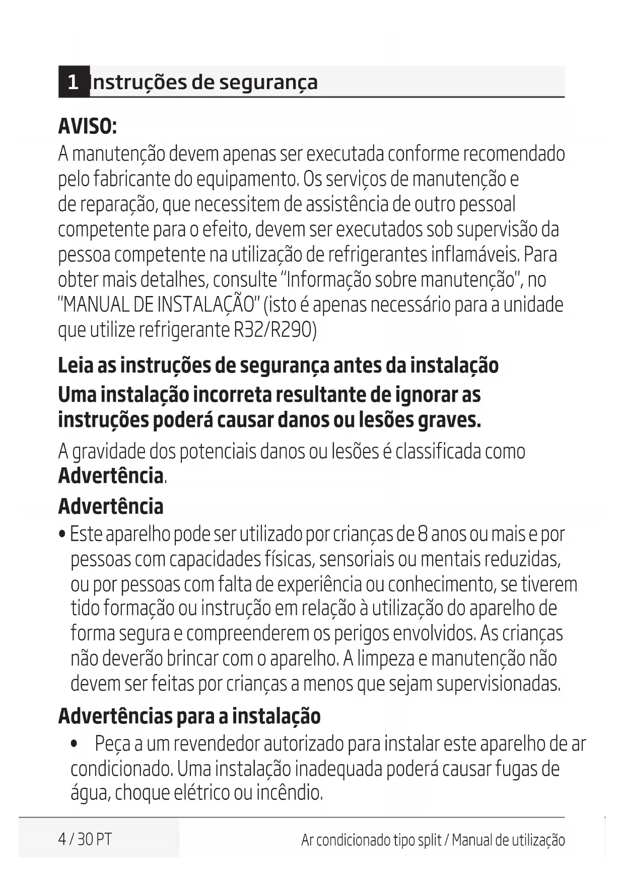 3 / 30 PTAr condicionado tipo split / Manual de utilização 1 Instruções de segurança AVISO: A manutenção devem apenas ser executada conforme recomendado pelo fabricante do equipamento. Os serviços de manutenção e de reparação, que necessitem de assistência de outro pessoal competente para o efeito, devem ser executados sob supervisão da pessoa competente na utilização de refrigerantes inflamáveis. Para obter mais detalhes, consulte “Informação sobre manutenção", no "MANUAL DE INSTALAÇÃO" (isto é apenas necessário para a unidade que utilize refrigerante R32/R290) Leia as instruções de segurança antes da instalação Uma instalação incorreta resultante de ignorar as instruções poderá causar danos ou lesões graves. A gravidade dos potenciais danos ou lesões é classificada como Advertência. Advertência t Este aparelho pode ser utilizado por crianças de 8 anos ou mais e por pessoas com capacidades físicas, sensoriais ou mentais reduzidas, ou por pessoas com falta de experiência ou conhecimento, se tiverem tido formação ou instrução em relação à utilização do aparelho de forma segura e compreenderem os perigos envolvidos. As crianças não deverão brincar com o aparelho. A limpeza e manutenção não devem ser feitas por crianças a menos que sejam supervisionadas. Advertências para a instalação t Peça a um revendedor autorizado para instalar este aparelho de ar condicionado. Uma instalação inadequada poderá causar fugas de água, choque elétrico ou incêndio. 4 / 30 PTAr condicionado tipo split / Manual de utilização t Todas as reparações, manutenção e reposicionamento desta unidade deverão ser realizadas por um técnico de manutenção autorizado. Reparações inadequadas poderão originar ferimentos graves ou avaria do produto. Advertências para a utilização do produto t Caso surja uma situação anómala (como um cheiro a queimado), desligue imediatamente a unidade e remova a ficha da tomada. Contacte o seu revendedor para obter instruções sobre como evitar choque elétrico, incêndio ou ferimentos. t Não insira os dedos, barras ou outros objetos nas saídas ou entradas de ar. Tal poderá originar ferimentos, uma vez que a ventoinha poderá estar a girar a alta velocidade. t Não utilize sprays inflamáveis tais como spray para cabelo, verniz ou tinta perto da unidade. Tal poderá originar incêndio ou combustão. t Não utilize o aparelho de ar condicionado em locais próximos ou nas imediações de gases combustíveis. O gás emitido poderá concentrar-se à volta da unidade e causar uma explosão. t Não utilize o aparelho de ar condicionado em divisões molhadas (por ex., casa de banho ou lavandaria). Tal poderá provocar um choque elétrico e fazer com que o produto se deteriore. t Não exponha o seu corpo diretamente ao ar frio durante um período longo de tempo. Precauções elétricas t Utilize apenas o cabo de alimentação especificado. No caso de o cabo de alimentação estar danificado, este deverá ser substituído pelo fabricante ou por um fornecedor de serviços certificado. 1 Instruções de segurança 5 / 30 PTAr condicionado tipo split / Manual de utilização t Mantenha o cabo de alimentação limpo. Remova todo o pó ou sujidade que se acumula na tomada ou à volta desta. Tomadas sujas poderão provocar um incêndio ou um choque elétrico. t Não puxe pelo cabo de alimentação para desligar a unidade. Segure firmemente na ficha e remova-a da tomada. Puxar diretamente pelo cabo poderá danificá-lo, o que poderá provocar um incêndio ou um choque elétrico. t Não utilize uma extensão, não aumente manualmente o cabo e não ligue outros aparelhos à mesma fonte de alimentação do aparelho de ar condicionado. Ligações elétricas mal efetuadas, um mau isolamento e uma voltagem insuficiente poderão provocar um incêndio. Precauções de limpeza e manutenção t Desligue o aparelho e remova a ficha da tomada antes de limpar. O não cumprimento desta medida poderá provocar um choque elétrico. t Não limpe o aparelho de ar condicionado com uma quantidade excessiva de água. t Não limpe o aparelho de ar condicionado com agentes de limpeza combustíveis. Os agentes de limpeza combustíveis poderão provocar um incêndio ou deformação. Advertência t Se o aparelho de ar condicionado for utilizado em simultâneo com queimadores ou outros dispositivos de aquecimento, ventile a divisão de forma rigorosa para evitar falta de oxigénio. t Desligue o aparelho de ar condicionado e remova a ficha da unidade da tomada se não pretender utilizá-lo durante um período de tempo prolongado. 1 Instruções de segurança 6 / 30 PTAr condicionado tipo split / Manual de utilização 1 Instruções de segurança t Desligue e remova a ficha da unidade durante as tempestades. t Assegure-se de que a condensação de água drena de forma desimpedida da unidade. t Não utilize o aparelho de ar condicionado com as mãos molhadas. Tal poderá originar um choque elétrico. t Não utilize o aparelho para outros fins que não o seu uso previsto. t Não suba para a unidade exterior nem coloque objetos em cima da mesma. t Não permita que o aparelho de ar condicionado funcione durante períodos de tempo prolongados com as portas ou janelas abertas, ou se a humidade for muito elevada. 7 / 30 PTAr condicionado tipo split / Manual de utilização