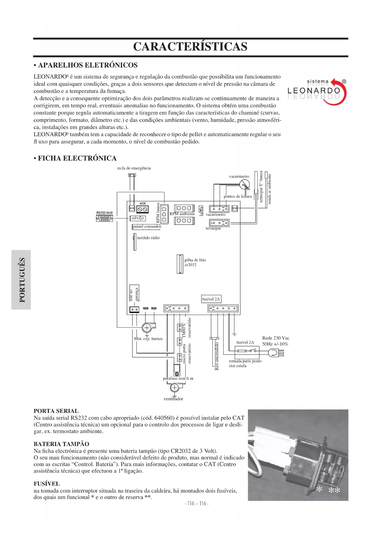 - FICHA ELECTRÓNICA Rede 230 Vac50Hz +/-10%pilha de lítio cr2032Mot. exp. humosventiladorRes encendidomódulo rádiotomada parte poste-rior estufatermoparvacuómetroRPM ambientevacuómetrotecla de emergênciapontos de leituratermopar T° fumossonda ar ambientemicro porta reservatórioserviçopainel comandosRPM fumosrelé se-gurançafusível 2Afusível 2Aparafuso sem fi mTM80°C reservatório- 117 -- 117 - PORTUGUÊS CARACTERÍSTICAS