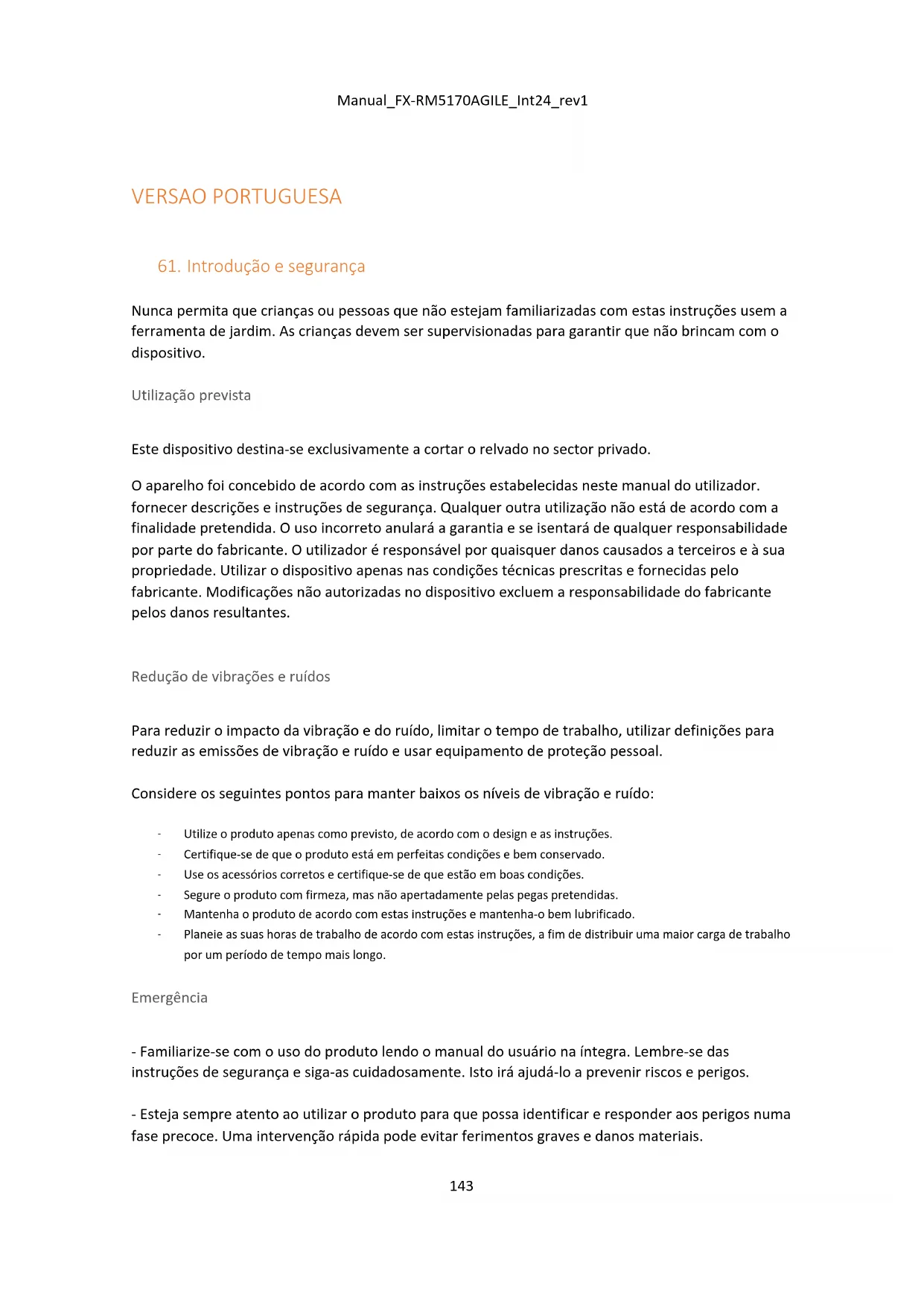 Planeie as suas horas de trabalho de acordo com estas instruções, a fim de distribuir uma maior carga de trabalho por um período de tempo mais longo. Emergência - Familiarize-se com o uso do produto lendo o manual do usuário na íntegra. Lembre-se das instruções de segurança e siga-as cuidadosamente. Isto irá ajudá-lo a prevenir riscos e perigos. - Esteja sempre atento ao utilizar o produto para que possa identificar e responder aos perigos numa fase precoce. Uma intervenção rápida pode evitar ferimentos graves e danos materiais.Manual_FX-RM5170AGILE_Int24_rev1