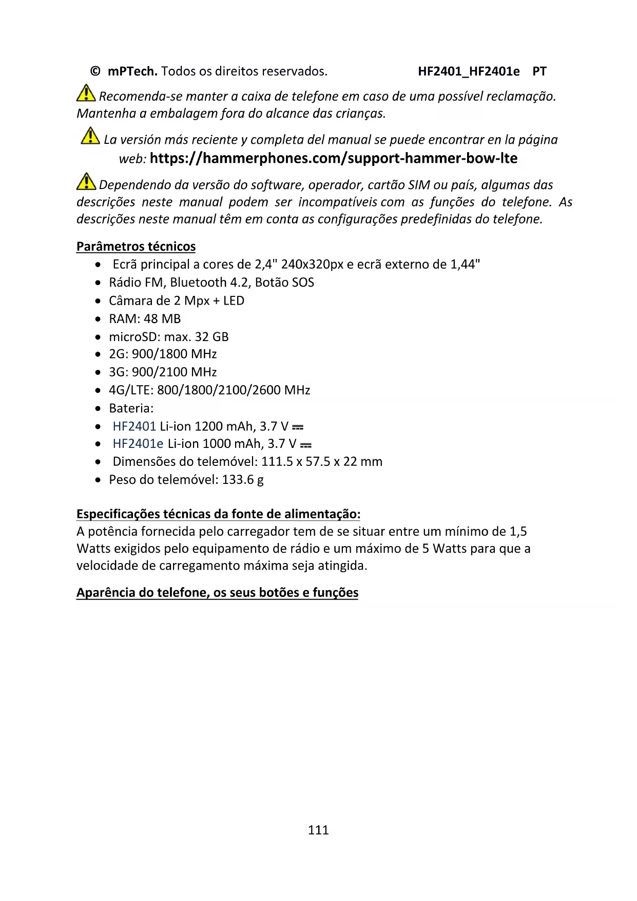 Recomenda-se manter a caixa de telefone em caso de uma possível reclamação. Mantenha a embalagem fora do alcance das crianças. La versión más reciente y completa del manual se puede encontrar en la página web: https://hammerphones.com/support-hammer-bow-lte Dependendo da versão do software, operador, cartão SIM ou país, algumas das descrições neste manual podem ser incompatíveis com as funções do telefone. As descrições neste manual têm em conta as configurações predefinidas do telefone. Parâmetros técnicos