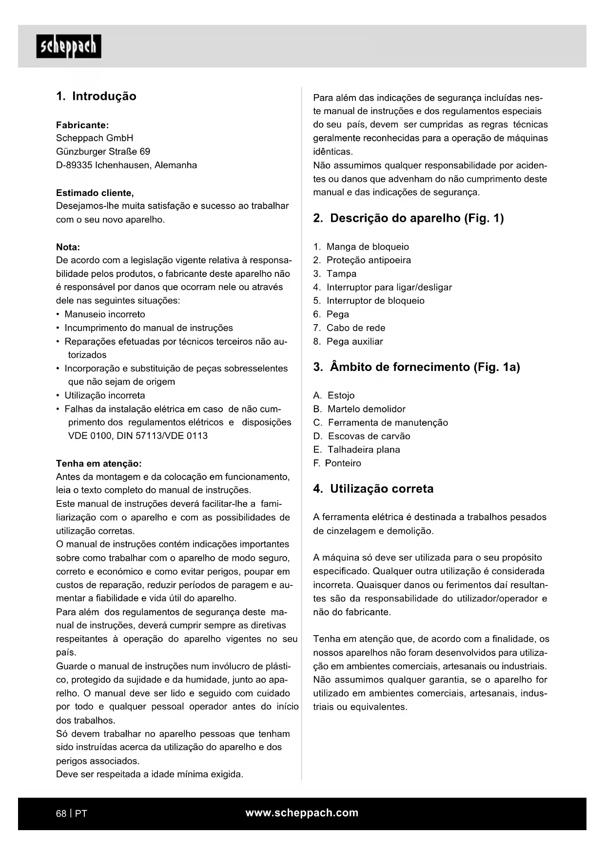 Tenha em atenção: Antes da montagem e da colocação em funcionamento, leia o texto completo do manual de instruções. Este manual de instruções deverá facilitar-lhe a fami- liarização com o aparelho e com as possibilidades de utilização corretas. O manual de instruções contém indicações importantes sobre como trabalhar com o aparelho de modo seguro, correto e económico e como evitar perigos, poupar em custos de reparação, reduzir períodos de paragem e au- mentar a abilidade e vida útil do aparelho. Para além dos regulamentos de segurança deste ma- nual de instruções, deverá cumprir sempre as diretivas respeitantes à operação do aparelho vigentes no seu país. Guarde o manual de instruções num invólucro de plásti- co, protegido da sujidade e da humidade, junto ao apa- relho. O manual deve ser lido e seguido com cuidado por todo e qualquer pessoal operador antes do início dos trabalhos. Só devem trabalhar no aparelho pessoas que tenham sido instruídas acerca da utilização do aparelho e dos perigos associados. Deve ser respeitada a idade mínima exigida.www.scheppach.com