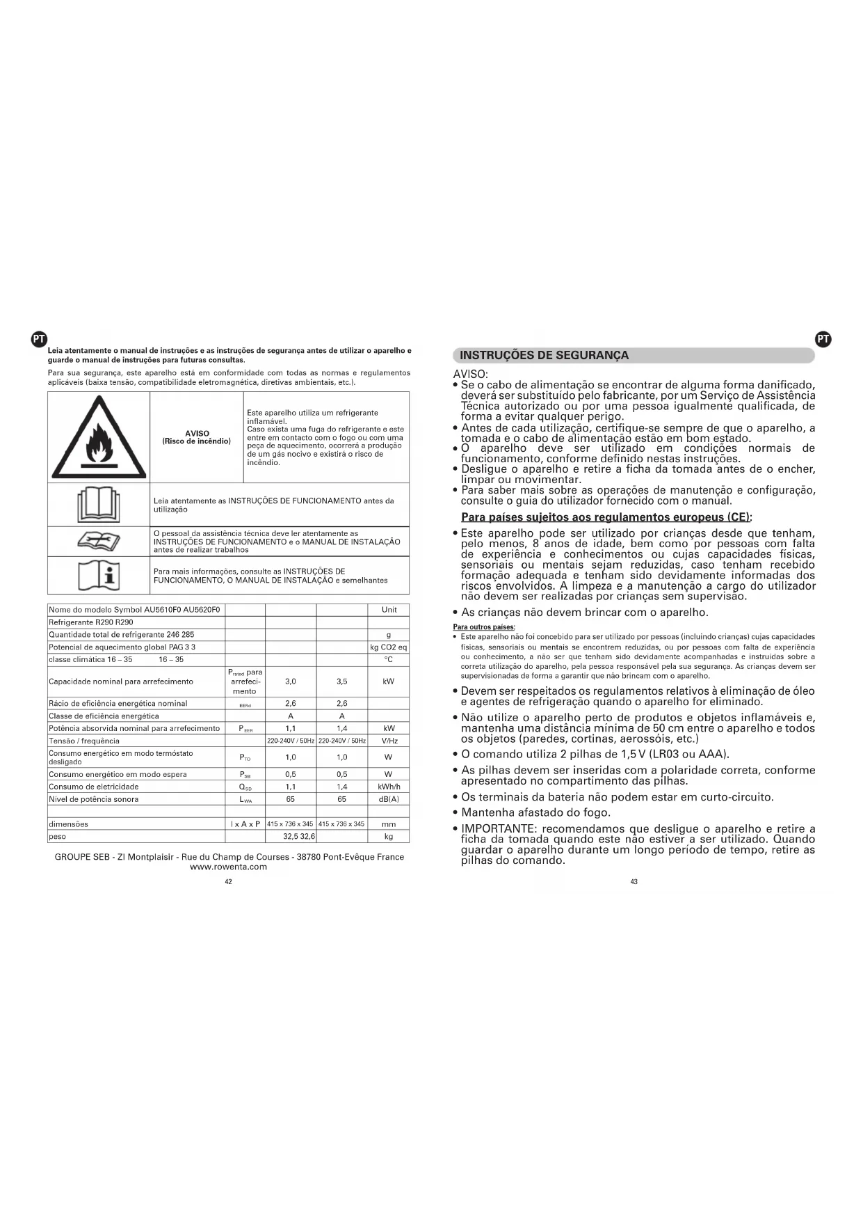 Nunca desmonte o aparelho pelos seus próprios meios, uma vez que o gás R290 requer um acordo específico para a reparação. Um aparelho mal reparado pode ser perigoso para o utilizador. Não utilize o aparelho e contacte um Serviço de Assistência Técnica autorizado se: • O aparelho tiver sofrido uma queda. • O aparelho ou o cabo de alimentação estiverem danificados. • O aparelho não funcionar corretamente. Pode encontrar uma lista de Serviços de Assistência Técnica autorizados no website da Rowenta. PROTEÇÃO DO AMBIENTE EM PRIMEIRO LUGAR! O aparelho contém materiais valiosos que podem ser recuperados ou reciclados. Entregue-o num ponto de recolha de resíduos, para possibilitar o seu tratamento. Não elimine as pilhas juntamente com o lixo doméstico. Entregue-as em pontos de recolha próprios para pilhas. Também pode encontrar estas instruções no nosso site www.rowenta.comITIT