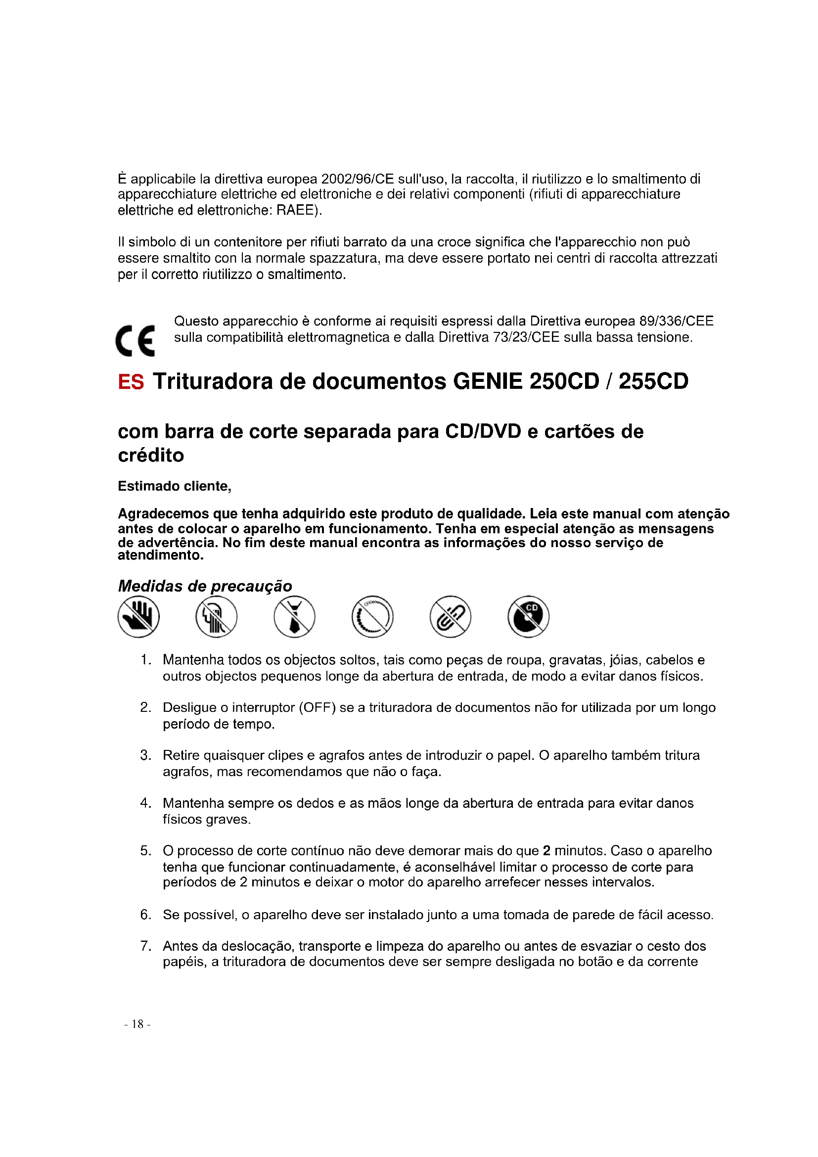 Questo apparecchio è conforme ai requisiti espressi dalla Direttiva europea 89/336/CEE sulla compatibilità elettromagnetica e dalla Direttiva 73/23/CEE sulla bassa tensione. ES Trituradora de documentos GENIE 250CD / 255CD com barra de corte separada para CD/DVD e cartões de crédito Estimado cliente, Agradecemos que tenha adquirido este produto de qualidade. Leia este manual com atenção antes de colocar o aparelho em funcionamento. Tenha em especial atenção as mensagens de advertência. No fim deste manual encontra as informações do nosso serviço de atendimento. Medidas de precaução