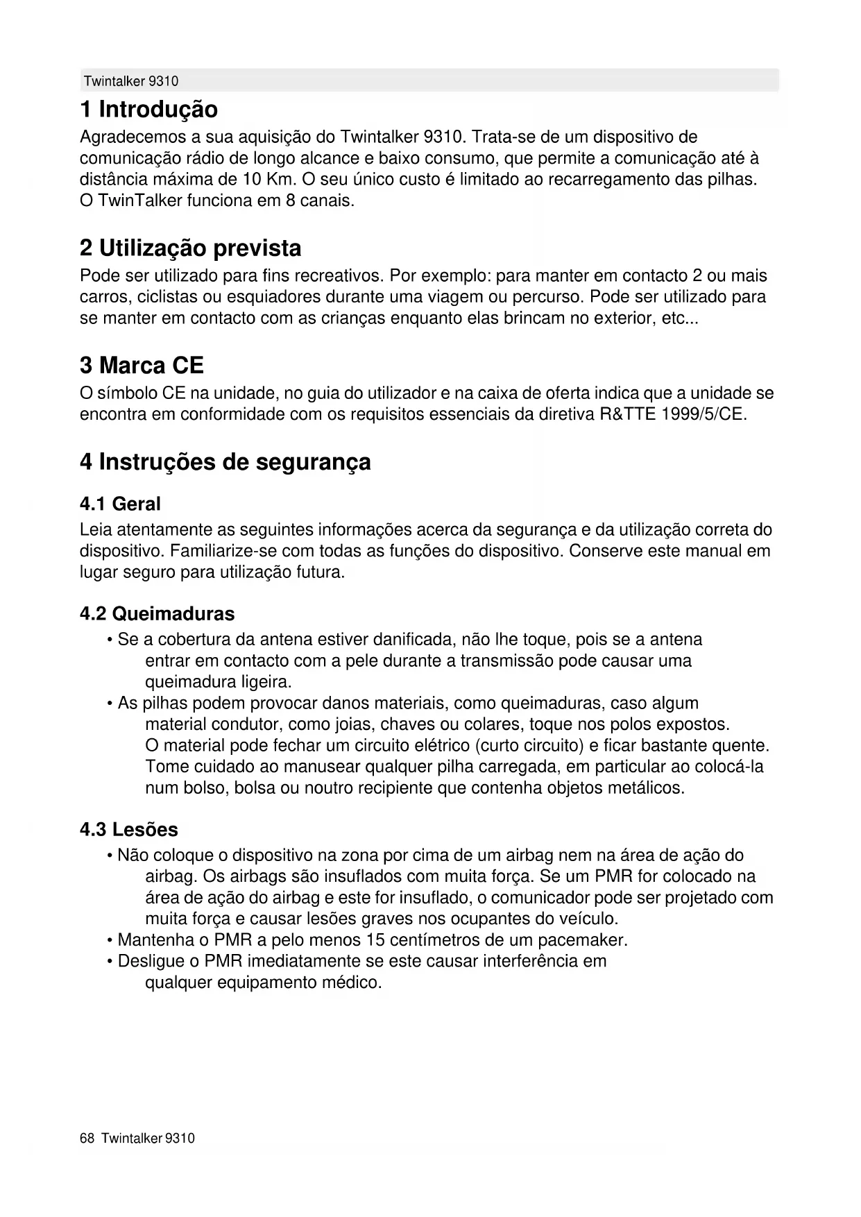 Agradecemposa sua aquisicao do Twintalker 9310. Trata-se de um dispositivo de comunacao rado de longo alcance e baixoconsumo,que permite a comunacao atae a distancia maxima de 10Km .O seu unico custo e limitado ao recarregamento das pilhas. O TwinTalker funcaoa em 8 canais.