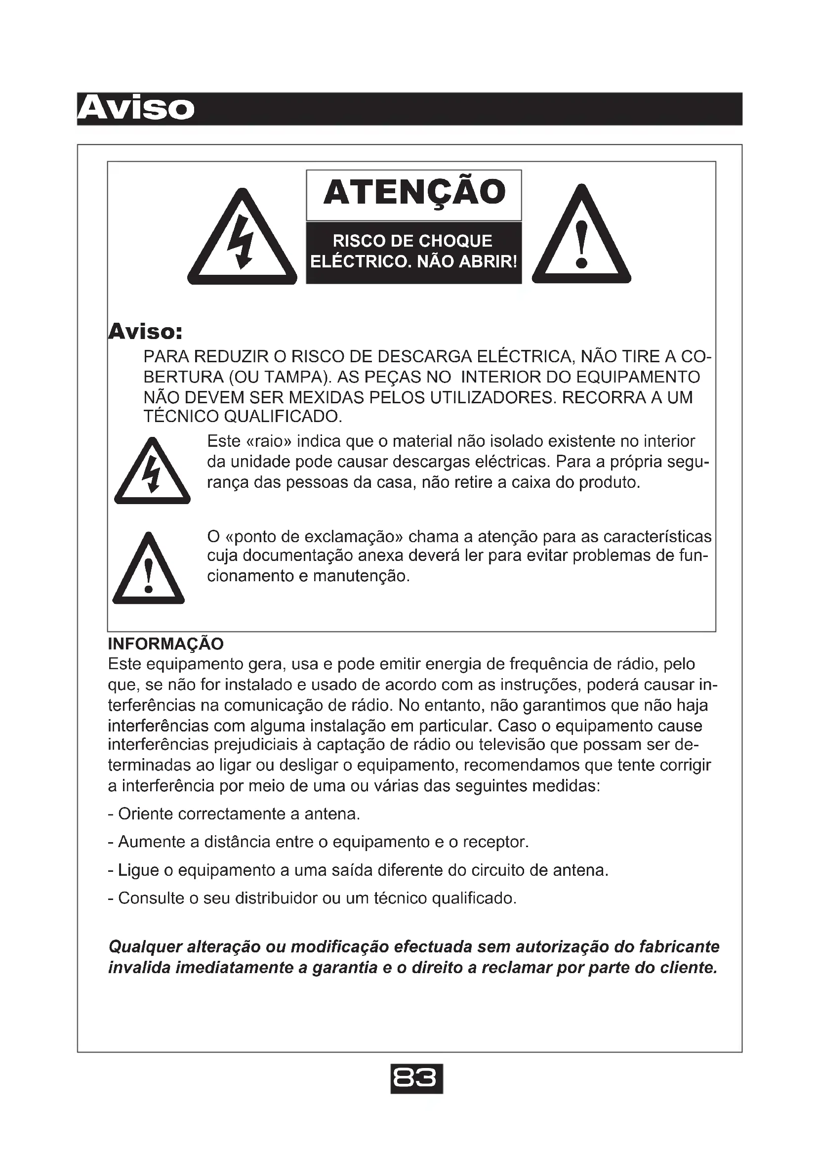 Este «raio» indica que o material não isolado existente no interiorda unidade pode causar descargas eléctricas. Para a própria segu-rança das pessoas da casa, não retire a caixa do produto.O «ponto de exclamação» chama a atenção para as característicascuja documentação anexa deverá ler para evitar problemas de fun-cionamento e manutenção.INFORMAÇÃO Este equipamento gera, usa e pode emitir energia de frequência de rádio, peloque, se não for instalado e usado de acordo com as instruções, poderá causar in-terferências na comunicação de rádio. No entanto, não garantimos que não hajainterferências com alguma instalação em particular. Caso o equipamento causeinterferências prejudiciais à captação de rádio ou televisão que possam ser de-terminadas ao ligar ou desligar o equipamento, recomendamos que tente corrigira interferência por meio de uma ou várias das seguintes medidas: - Oriente correctamente a antena. - Aumente a distância entre o equipamento e o receptor. - Ligue o equipamento a uma saída diferente do circuito de antena. - Consulte o seu distribuidor ou um técnico qualificado. Qualquer alteração ou modificação efectuada sem autorização do fabricanteinvalida imediatamente a garantia e o direito a reclamar por parte do cliente.