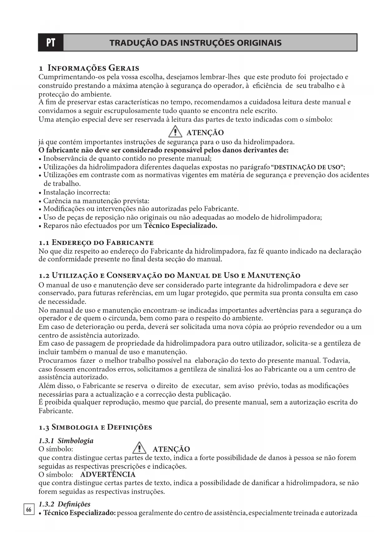 No manual de uso e manutenção encontrar-se indicadas importantes advertências para a segurar da operador e de quem o circunda, bem como para o respeito do ambiente.