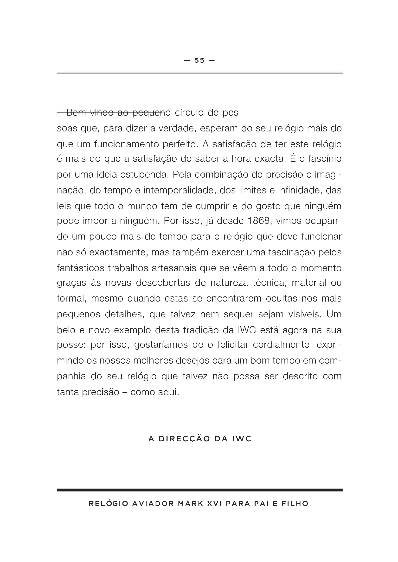 1— 58 — relógio aViador Mark XVi para pai e Filho aS FunçõeS da coroa X — Posição normal (enroscada) 0 — Posição para dar corda 1 — Acerto da data 2 — Acerto do tempo a poSição norMal Este relógio possui uma coroa de rosca. A união roscada (posi- ção normal, posição X) impede um desacerto inadvertido das ho- ras ou da data, protegendo, além disso, a caixa contra a entrada de água. Para destravar, desenrosca-se a coroa para a esquerda, ficando então automaticamente na posição 0, que é a posição para dar corda. Empurrando a coroa para dentro, para a posição X, e rodando-a simultaneamente para a direita, esta volta a ficar totalmente enroscada e travada. X 0 1 2— 59 — relógio aViador Mark XVi para pai e Filho a poSição para dar corda Na posição para dar corda (0), também pode dar corda ma- nualmente ao movimento automático. Para pôr a funcionar o movimento, basta rodar a coroa algumas voltas. No entanto, recomendamos rodar a coroa cerca de 20 voltas. Pois, assim, garante-se a máxima precisão da marcha. o acerto da data Se um mês tiver menos de 31 dias, a data terá de ser acertada manualmente para o primeiro dia do mês seguinte. Para isso, sol- te e puxe a coroa de rosca, deixando-a na posição 1. Rodando-a para a esquerda, pode agora mudar a data (ligação rápida). No período entre as 20 e as 2 horas não deve proceder a nenhum acerto rápido, pois neste espaço de tempo, a data continua a ser automaticamente comutada pelo movimento.— 60 — relógio aViador Mark XVi para pai e Filho o acerto do teMpo Puxe a coroa para a posição 2. Desta maneira, faz parar o movi- mento. Para proceder a um acerto ao segundo, é preferível fazer parar o movimento sobre os 60 durante a passagem do ponteiro dos segundos. Mova agora o ponteiro dos minutos alguns tra- ços para além do tempo a acertar. Posicione a seguir o ponteiro dos minutos movendo-o ligeiramente para trás, de forma a ficar exactamente no traço dos minutos a acertar. Este procedimento garante que, no momento em que iniciar o movimento, o ponteiro dos minutos continua a mover-se sem causar um atraso. Para fazer arrancar o ponteiro dos segundos, empurre a coroa para dentro, na posição 0. Ao acertar o tempo, preste atenção à co- mutação da data, que se faz sempre à meia-noite (24 horas). Se esta se realizar já ao meio-dia (12 horas), terá de fazer avançar os ponteiros 12 horas. Importante: Nas posições 0, 1 e 2, o relógio mantém-se resisten- te à água, mas a coroa tem de voltar a ser enroscada, para que o relógio possa ser usado normalmente (posição X).— 61 — relógio aViador Mark XVi para pai e Filho a leitura daS horaS na eScuridão O mostrador, assim como os ponteiros das horas e dos minutos estão equipados com elementos luminescentes, que permitem uma leitura perfeita das horas, mesmo em completa escuridão. O triângulo característico na posição das 12 horas serve de orien- tação. a reSiStência à água Nos relógios IWC, a indicação da resistência à água é dada em bar e não em metros. As indicações em metros, frequente- mente usadas na indústria relojoeira para indicar a resistência à água, não correspondem à profundidade do mergulho devido aos processos de ensaio que se costumam utilizar. Por isso, as indicações em metros não permitem tirar qualquer conclusão relativamente às verdadeiras possibilidades de uso do relógio em ambientes húmidos, molhados na água ou debaixo de água. Po- derá encontrar recomendações relacionadas com a resistência à água do seu relógio em www.iwc.com/water-resistance. O seu concessionário IWC oficial e autorizado (Official Agent) terá tam- bém todo o prazer em prestar-lhe essa informação.— 62 — relógio aViador Mark XVi para pai e Filho Para garantir um funcionamento perfeito do seu relógio, este de- verá ser examinado, pelo menos, uma vez por ano num posto de assistência técnica da IWC. Um tal exame terá de ser reali- zado igualmente após situações em que o relógio foi exposto a esforços extraordinários. Se estes exames não forem realizados correctamente ou caso o relógio seja aberto por pessoas não au- torizadas, a IWC não aceitará quaisquer reclamações no âmbito da garantia e declinará toda e qualquer responsabilidade. Recomendação: Depois de cada abertura e assistência do seu relógio IWC, o seu concessionário IWC oficial e autorizado (Offi- cial Agent) terá de efectuar novamente um teste de resistência à água. nota A pele é um material natural e permeável. Por isso, evite o con- tacto da sua bracelete de alta qualidade com a água, substân- cias oleosas, solventes e detergentes ou produtos cosméticos. Evitará, desta forma, descolorações e um envelhecimento rápido do material.— 63 — relógio aViador Mark XVi para pai e Filho a aSSiStência do Seu relógio aViador Mark XVi para pai e Filho Todos os componentes deste relógio são fabricados a partir dos melhores materiais. Apesar disso, há algumas peças que estão sujeitas a desgaste natural. O que é importante, sobretudo, é que estes pontos de desgaste estejam sempre lubrificados da melhor forma e que a sujidade provocada pelo óleo devido ao atrito me- tálico seja eliminada atempadamente. Por isso, recomendamos mandar examinar o seu relógio aprox. cada cinco anos num posto de assistência. Para isso, dirija-se a um concessionário IWC oficial e autorizado (Official Agent) ou directamente aos Ser- viços de Atendimento a Clientes da IWC em Schaffhausen. Edição: Outubro de 2011. Reservado o direito a alterações técnicas.Fliegeruhr Mark XVi Für Vater und Sohn — 64 — IWC Schaffhausen Branch of Richemont International SA Baumgartenstrasse 15 CH-8201 Schaffhausen Switzerland Phone +41 (0)52 635 65 65 Fax +41 (0)52 635 65 01 info@iwc.com www.iwc.com © Copyright 2011 IWC Schaffhausen, Branch of Richemont International SA Printed in Switzerlandwww.iwc.com IWA64226/10.11/0.75 