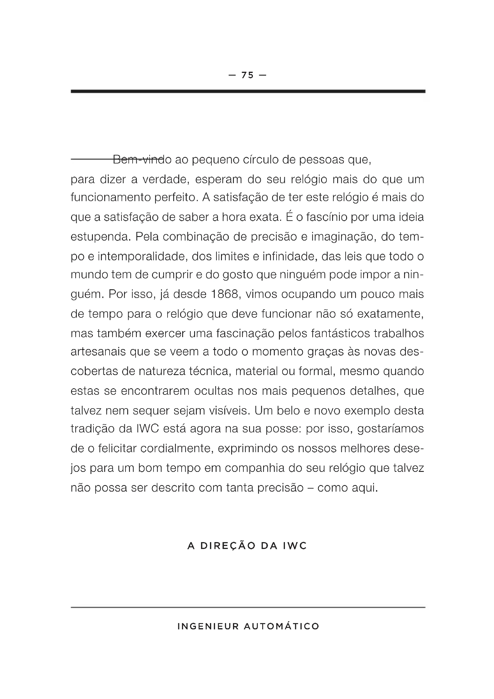 1— 78 — ingenieur autOMáticO as Funções da cOrOa X — Posição normal (enroscada) 0 — Posição para dar corda 1 — Acerto da data 2 — Acerto do tempo a pOsiçÃO nOrMal Este relógio possui uma coroa de rosca. A união roscada (posi- ção normal, X) impede um desacerto inadvertido das horas ou da data, protegendo, além disso, a caixa contra a entrada de água. Para destravar, desenrosca-se a coroa para a esquerda, ficando então automaticamente na posição 0, que é a posição para dar corda. Empurrando a coroa para dentro, para a posição X, e rodando-a simultaneamente para a direita, esta volta a ficar totalmente enroscada e travada. X 0 1 2— 79 — ingenieur autOMáticO a pOsiçÃO para dar cOrda Na posição para dar corda (0), também pode dar corda manual- mente ao movimento automático. Para pôr a funcionar o movi- mento, basta rodar a coroa algumas voltas. No entanto, recomen- damos rodar a coroa cerca de 20 voltas. Pois, assim, garante-se a máxima precisão da marcha. O acertO da data Se um mês tiver menos de 31 dias, a data terá de ser acertada manualmente para o primeiro dia do mês seguinte. Para isso, sol- te e puxe a coroa de rosca, deixando-a na posição 1. Rodando-a para a esquerda, pode agora mudar a data (ligação direta). No período entre as 20 e as 2 horas não deve proceder a nenhum acerto rápido, pois neste espaço de tempo a data continua a ser automaticamente comutada pelo movimento.— 80 — ingenieur autOMáticO O acertO dO teMpO Puxe a coroa para a posição 2. Desta maneira, faz parar o mo- vimento. Para proceder a um acerto com uma precisão de se- gundos, é preferível fazer parar o movimento nos 60 durante a passagem do ponteiro dos segundos. Mova agora o ponteiro dos minutos alguns traços para além do tempo a acertar. Posicione a seguir o ponteiro dos minutos movendo-o ligeiramente para trás, de forma a ficar exatamente no traço dos minutos a acertar. Este procedimento garante que, no momento em que iniciar o movi- mento, o ponteiro dos minutos continua a mover-se sem causar um atraso. Para fazer arrancar o ponteiro dos segundos, empurre a coroa para dentro, na posição 0. Ao acertar o tempo, preste atenção à comutação da data, que se faz sempre à meia-noite (24 horas). Se esta se realizar já ao meio-dia (12 horas), terá de fazer avançar os ponteiros 12 horas. Importante: Nas posições 0, 1 e 2, o relógio mantém-se resis- tente à água, mas a coroa tem sempre de voltar a ser enroscada, para que o relógio possa ser usado normalmente (posição X).— 81 — ingenieur autOMáticO a leitura das hOras na escuridÃO O mostrador, assim como os ponteiros das horas e dos minutos estão equipados com elementos luminescentes, que permitem uma leitura perfeita das horas, mesmo em completa escuridão. O elemento luminescente na posição das 12 horas serve de orientação. O ManuseaMentO e O ajuste da Bracelete de Metal A bracelete de metal foi concebida de forma a permitir-lhe uma adaptação fácil ao tamanho do seu pulso. Esta adaptação faz-se através da remoção ou adição de elos individuais à bracelete.— 82 — ingenieur autOMáticO a separaçÃO da Bracelete Abra o fecho de engate premindo as teclas laterais. Coloque a bracelete em cima de uma base firme, com o lado exterior vira- do para baixo. Para evitar arranhaduras na bracelete ou na base, convém meter um pano debaixo da bracelete. Com a ferra- menta auxiliar inclusa, poderá agora em- purrar o pino de fixação para baixo no ponto de separação preten- dido (1), deslizando ao mesmo tempo, com a segunda ferramenta auxiliar, o pino articulado cerca de 3 milímetros para fora (2). Remova agora o pino articulado que so- bressai da bracelete (3). Agora a bracelete está separada.— 83 — ingenieur autOMáticO a deterMinaçÃO dOs elOs a sereM reMOvidOs Meta o relógio em torno do seu pulso com o fecho de engate fechado e estime o nú- mero de elos excessivos sobrepondo as pontas da bracelete. Remova depois os elos excessivos, conforme descrito a se- guir: se precisar de tirar vários elos, reco- menda-se que remova o mesmo número de elos nos dois lados da bracelete, de modo a garantir que o fecho fique mais ou menos no meio do pulso.— 84 — ingenieur autOMáticO a reMOçÃO de elOs individuais e a ligaçÃO da Bracelete Repita os passos 1 a 3 respeitando a dis- tância acima determinada a partir do pri- meiro ponto de separação. Remova os elos soltos e volte a ligar a bra- celete. Introduza o pino articulado por um lado na bracelete (1). Com a ferramenta auxiliar inclusa, empurre agora o pino de fixação para baixo (2), em- purrando ao mesmo tempo o pino articulado para dentro até ficar nivelado com a bracele- te (3). O pino de fixação tem de ser movido novamente para cima até ficar alinhado com a borda superior do elo de bloqueio. Por fim, verifique o assento correto dos pinos de fixação. Guarde os elos excessivos e a ferramenta de separação num lugar seguro para possíveis adaptações posteriores.— 85 — ingenieur autOMáticO a resistência à água Nos relógios IWC, a indicação da resistência à água é dada em bar e não em metros. As indicações em metros, frequente- mente usadas na indústria relojoeira para indicar a resistência à água, não correspondem à profundidade do mergulho devido aos processos de ensaio que se costumam utilizar. Por isso, as indicações em metros não permitem tirar qualquer conclusão relativamente às verdadeiras possibilidades de uso do relógio em ambientes húmidos, molhados na água ou debaixo de água. Poderá encontrar recomendações relacionadas com a resistên- cia à água do seu relógio em www.iwc.com/water-resistance. O seu concessionário IWC oficial e autorizado (Official Agent) terá também todo o prazer em prestar-lhe essa informação. Para garantir um funcionamento perfeito do seu relógio, este deverá ser examinado, pelo menos, uma vez por ano num posto de assist