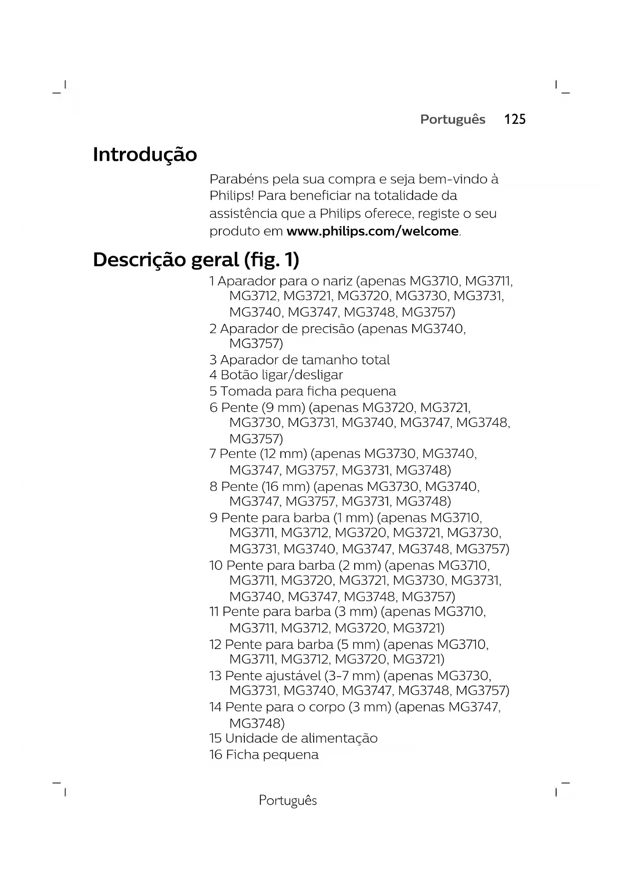 NorskPortuguês Introdução Parabéns pela sua compra e seja bem-vindo à Philips! Para beneficiar na totalidade da assistência que a Philips oferece, registe o seu produto em www.philips.com/welcome. Descrição geral (fig. 1) 1 Aparador para o nariz (apenas MG3710, MG3711, MG3712, MG3721, MG3720, MG3730, MG3731, MG3740, MG3747, MG3748, MG3757) 2 Aparador de precisão (apenas MG3740, MG3757) 3 Aparador de tamanho total 4 Botão ligar/desligar 5 Tomada para ficha pequena 6 Pente (9 mm) (apenas MG3720, MG3721, MG3730, MG3731, MG3740, MG3747, MG3748, MG3757) 7 Pente (12 mm) (apenas MG3730, MG3740, MG3747, MG3757, MG3731, MG3748) 8 Pente (16 mm) (apenas MG3730, MG3740, MG3747, MG3757, MG3731, MG3748) 9 Pente para barba (1 mm) (apenas MG3710, MG3711, MG3712, MG3720, MG3721, MG3730, MG3731, MG3740, MG3747, MG3748, MG3757) 10 Pente para barba (2 mm) (apenas MG3710, MG3711, MG3720, MG3721, MG3730, MG3731, MG3740, MG3747, MG3748, MG3757) 11 Pente para barba (3 mm) (apenas MG3710, MG3711, MG3712, MG3720, MG3721) 12 Pente para barba (5 mm) (apenas MG3710, MG3711, MG3712, MG3720, MG3721) 13 Pente ajustável (3-7 mm) (apenas MG3730, MG3731, MG3740, MG3747, MG3748, MG3757) 14 Pente para o corpo (3 mm) (apenas MG3747, MG3748) 15 Unidade de alimentação 16 Ficha pequena